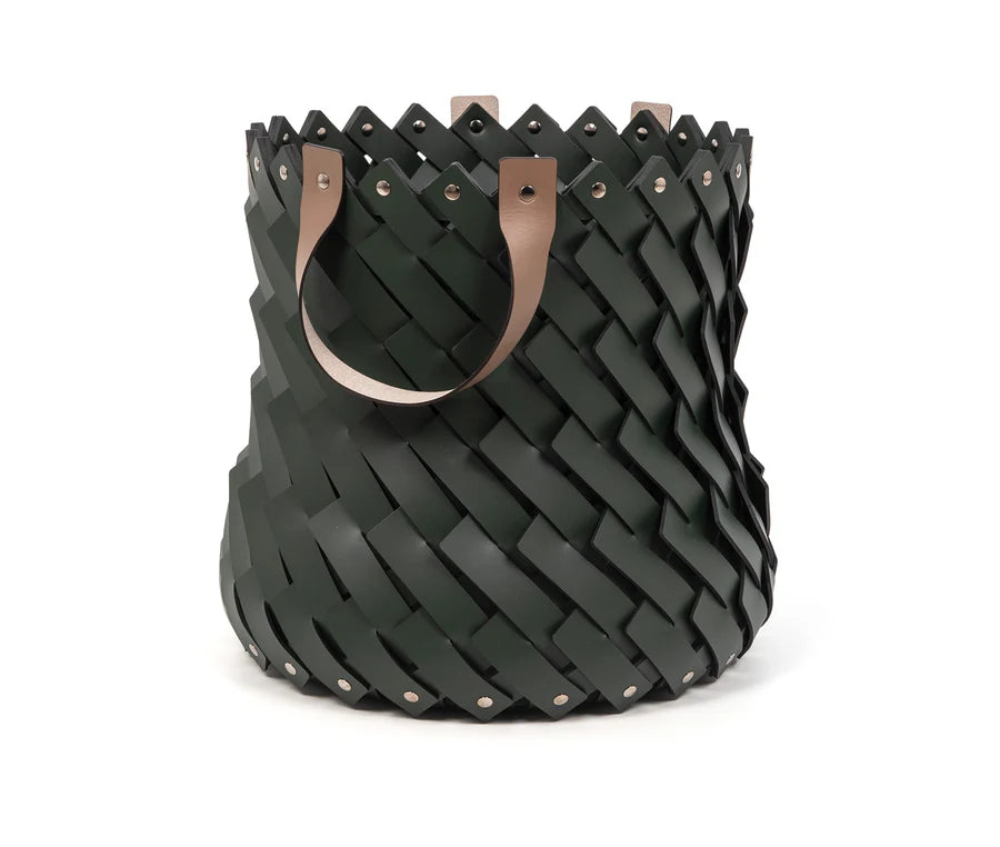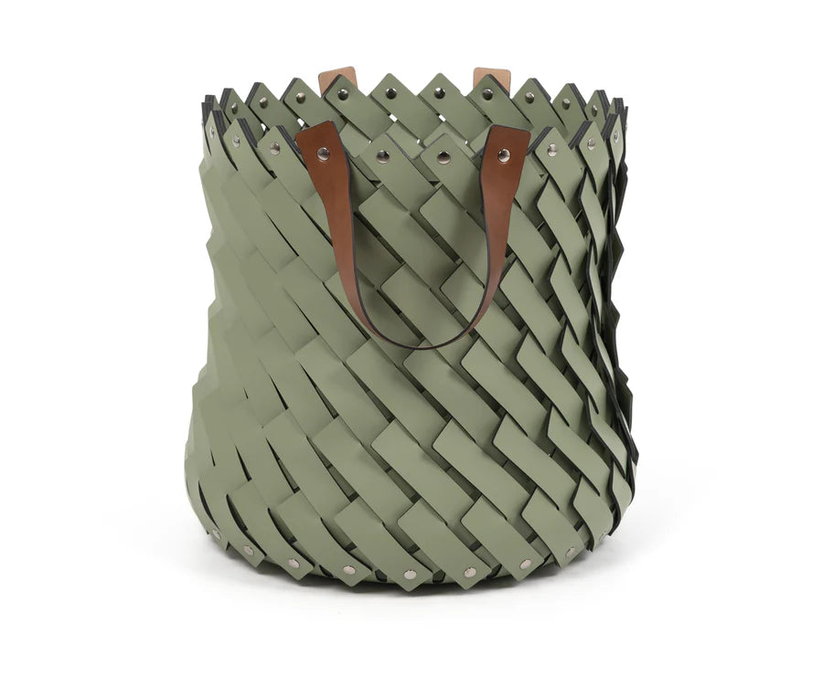 Un cesto con pratici manici color cuoio che, all'occorrenza, può trasformarsi in un portariviste, coperte o scarpe.