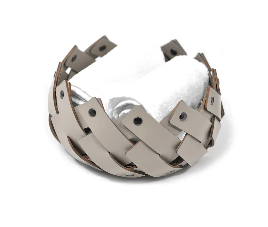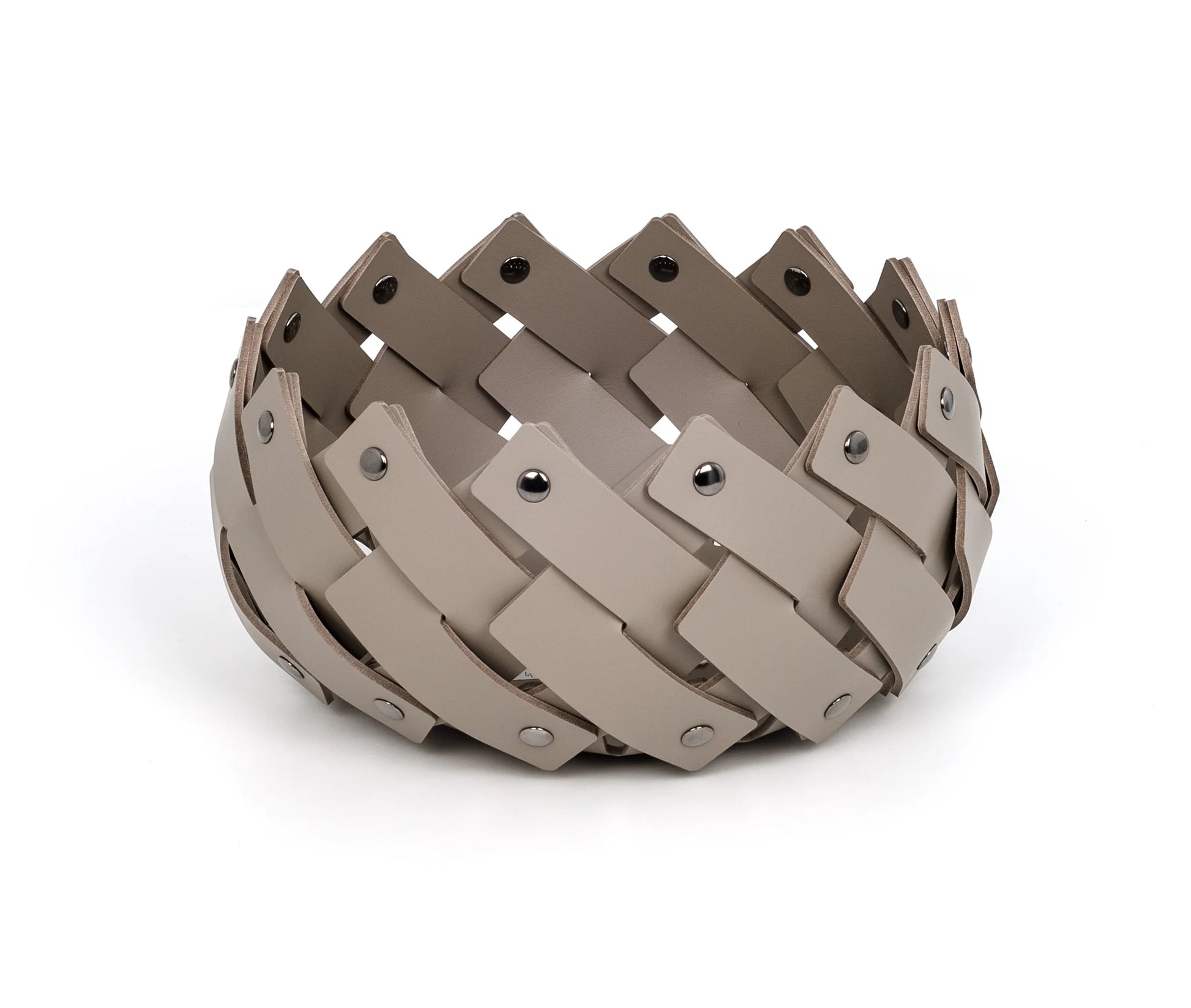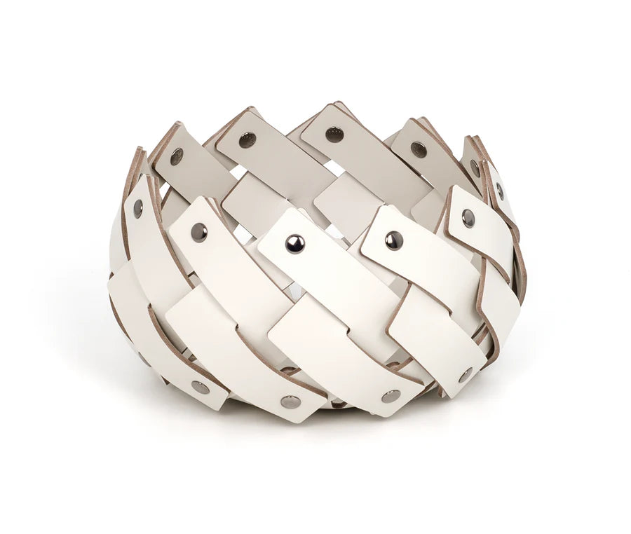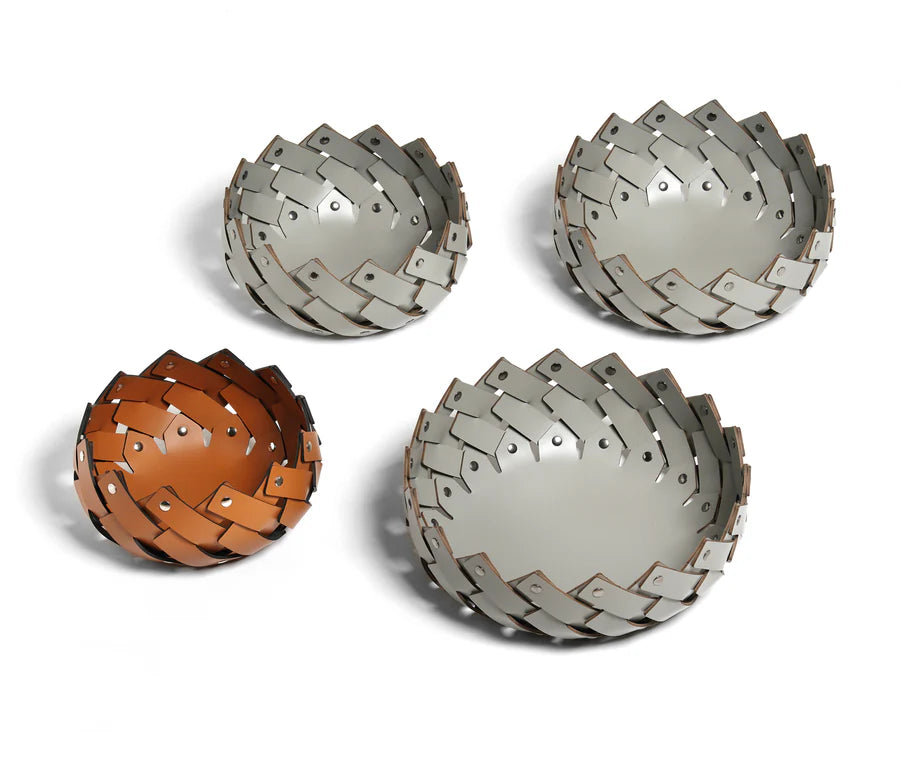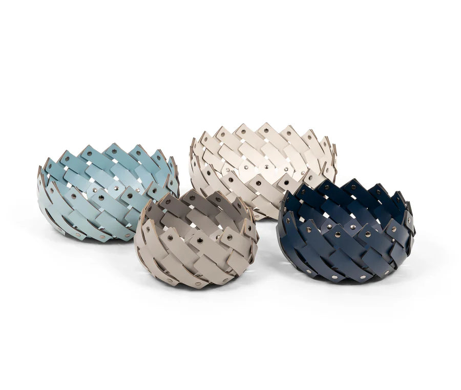 Disponibile in quattro diverse misure, resistenti all'acqua e fissati all'estremità con perni cromati. Le strisce intrecciate diventano sempre più piccole, per creare un perfetto complemento d'arredo per il bagno o trasformarsi in un perfetto svuotatasche.