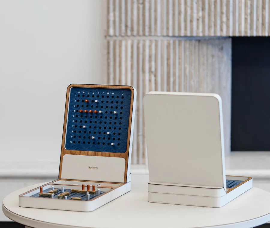 Il nuovo set Battaglia Navale di Pinetti: due scatole in legno di noce con coperchio magnetico, rivestite in pelle di vitello e dieci navi realizzate in prezioso ottone lucido e pioli metallici bicolore.