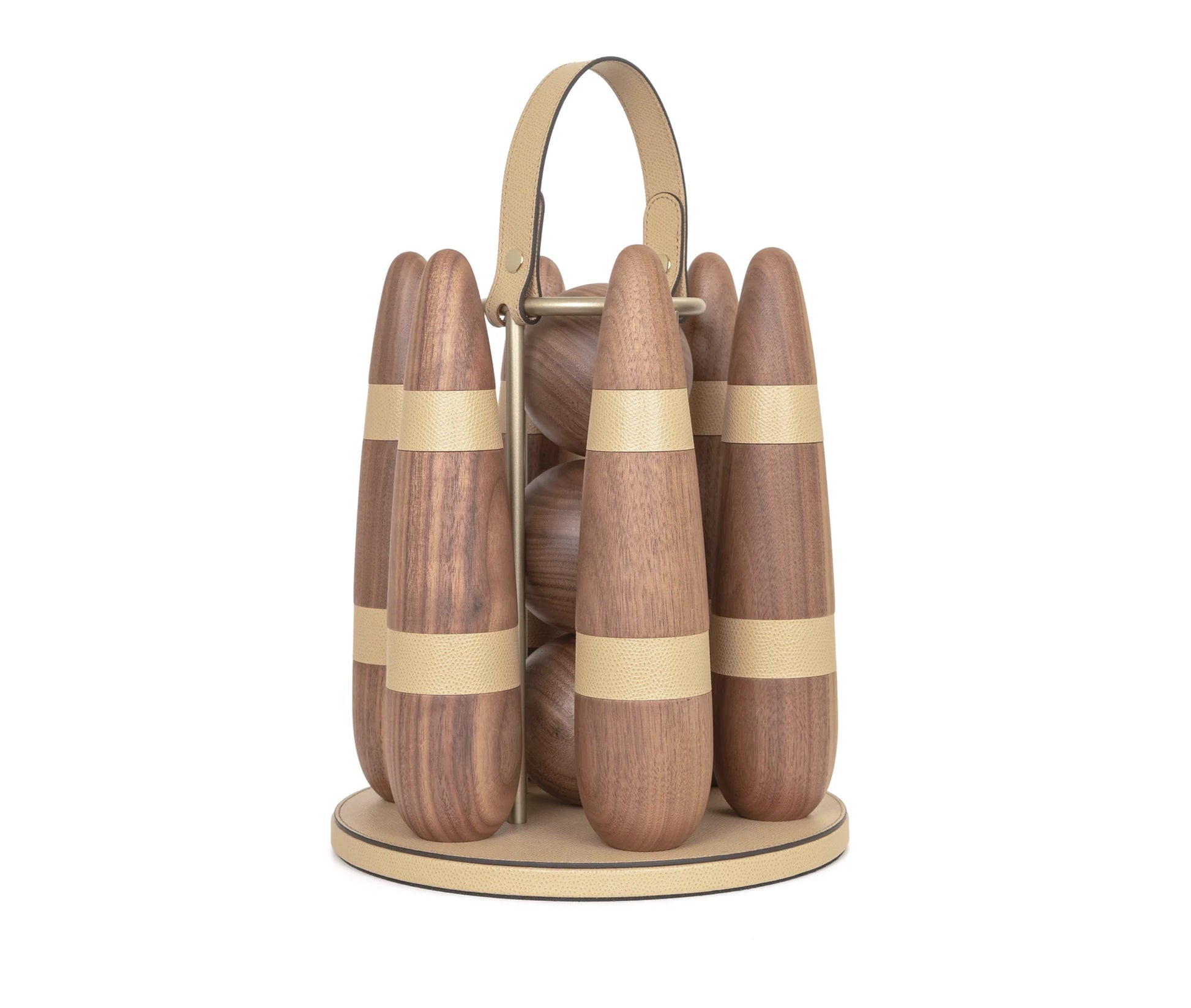 Più di un gioco. Magistralmente realizzato a mano con pregiato legno di noce canaletto, il nostro set da bowling portatile è impreziosito da dettagli in pelle e finiture in ottone satinato.