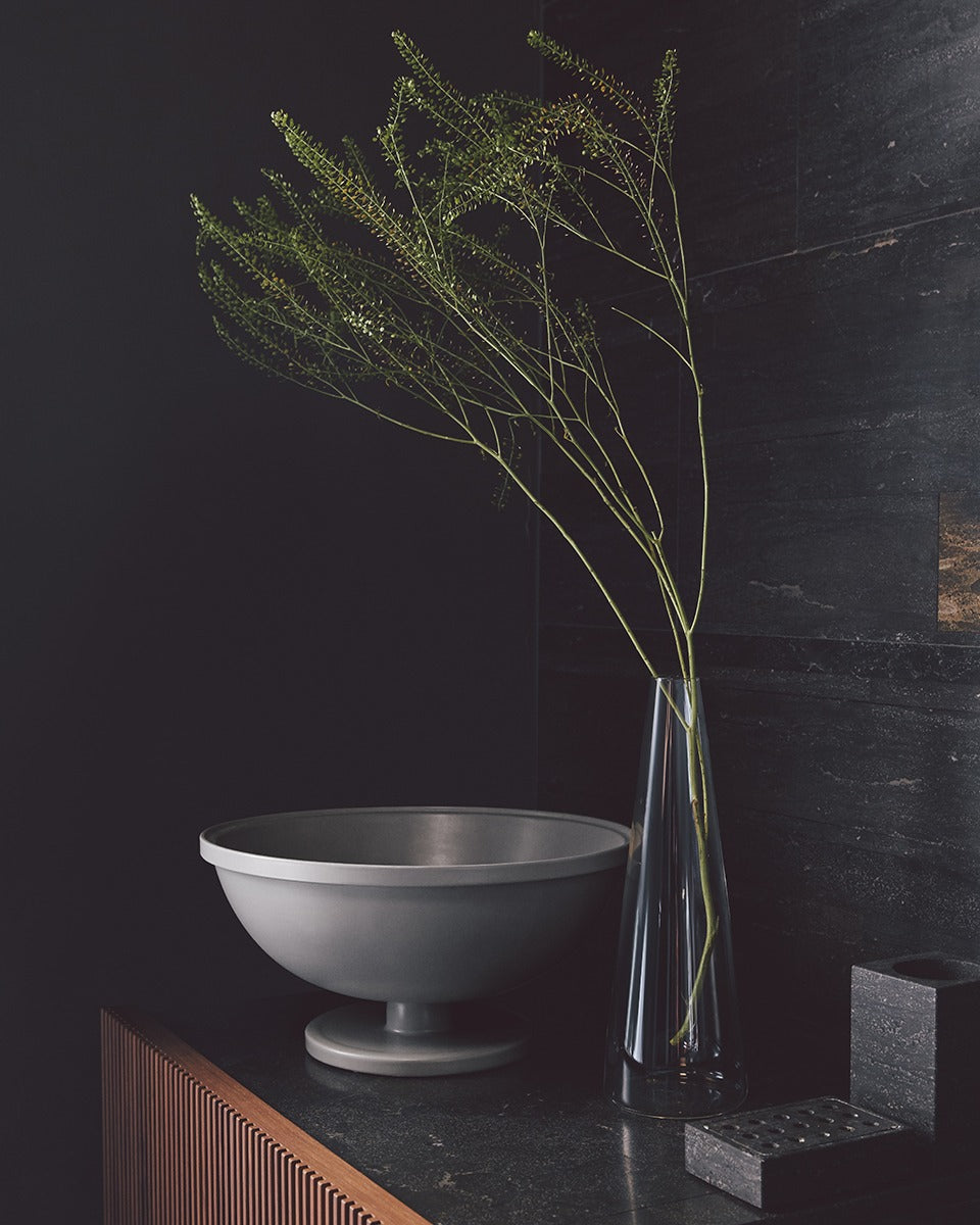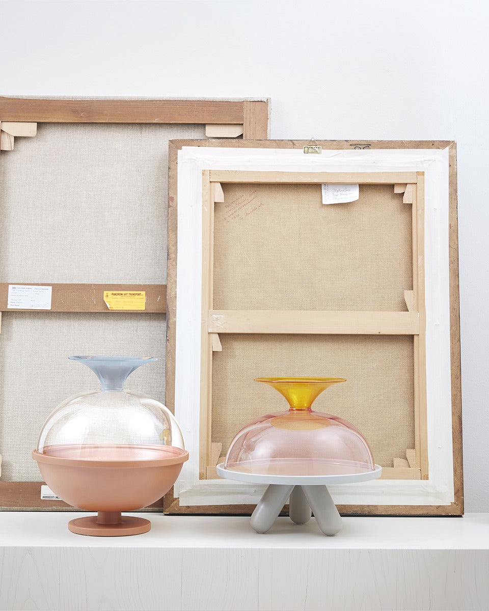 Grande centrotavola rotondo disponibile in 2 versioni: vetro borosilicato soffiato a bocca disponibile in 4 colori o ceramica disponibile in 3 colori.