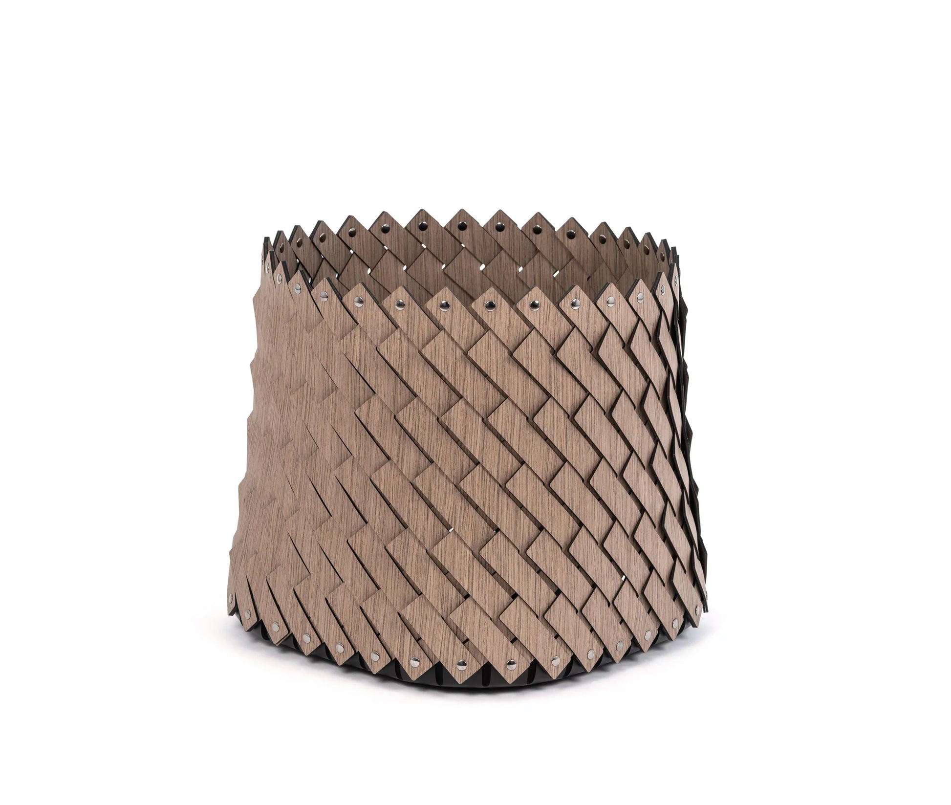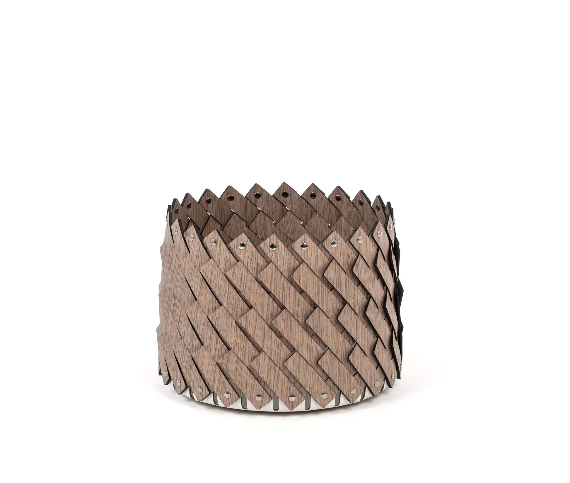 Un rivestimento decorativo in legno ricomposto con un elevato livello di flessibilità è il carattere principale di questa collezione che unita ad una base in pelle rigenerata danno vita alla nostra nuova linea cesti.