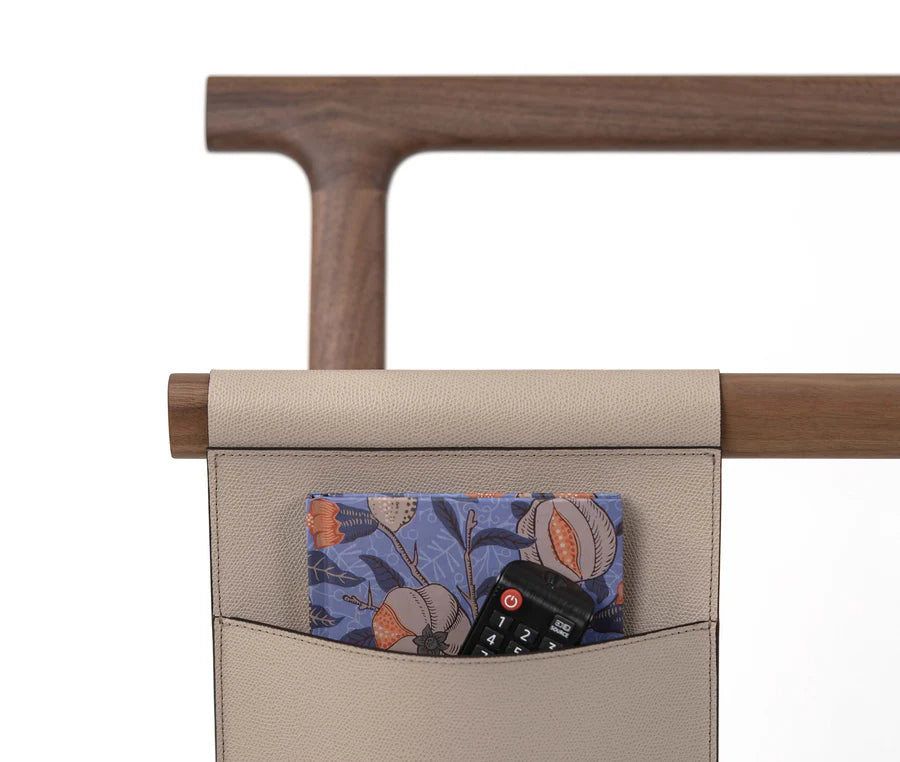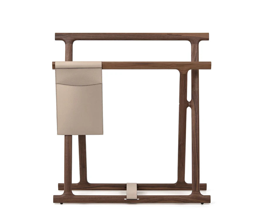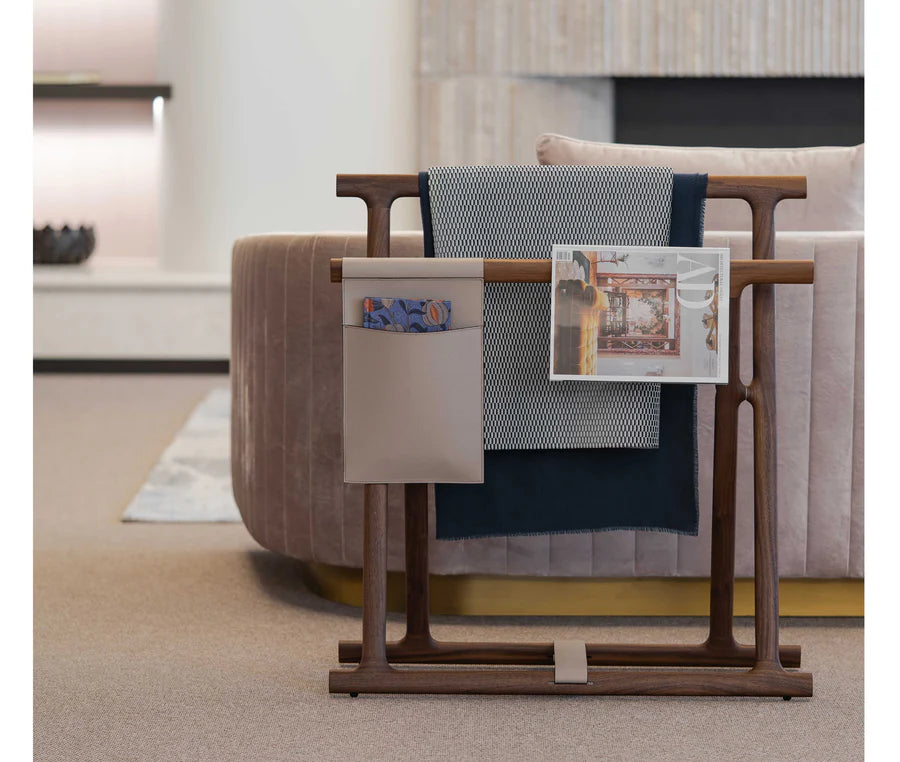 Il nostro porta coperte Chelsea ha una robusta struttura in legno di noce con una tasca in pelle rimovibile; l'aggiunta perfetta a qualsiasi angolo che desideri un tocco di raffinatezza.