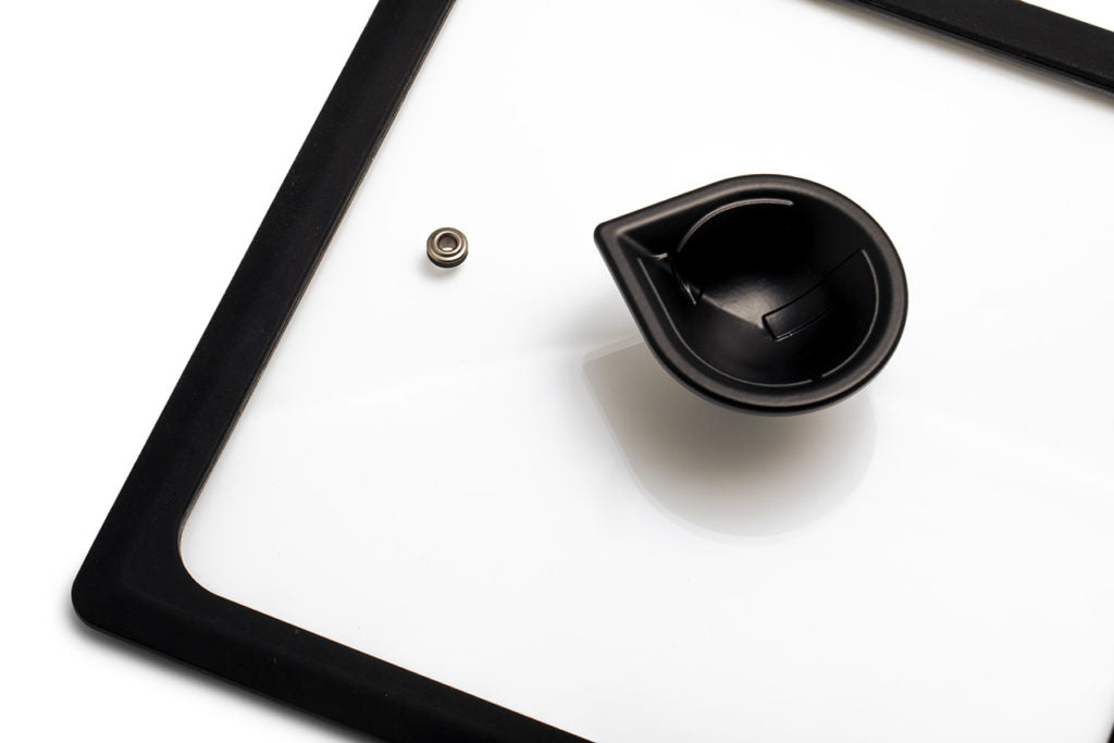 Coperchio in vetro temperato con pomello in alluminio e bordo in silicone, resistente al calore.