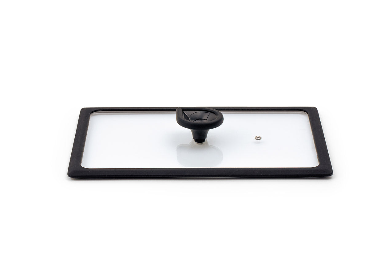 Coperchio in vetro temperato con pomello in alluminio e bordo in silicone, resistente al calore.