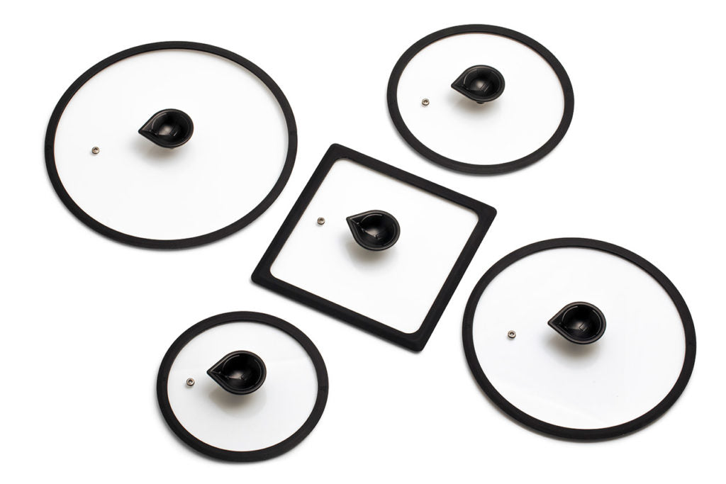 Coperchio in vetro temperato con pomello in alluminio e bordo in silicone, resistente al calore.