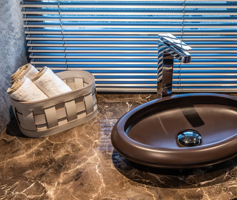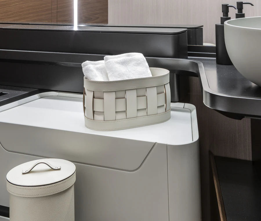 Perfetto anche per occhiali da sole e creme solari, il suo cuoio rigenerato trattato e idrorepellente lo rende adatto all'uso esterno. Disponibile in due misure, è la scelta perfetta a bordo di yacht o in qualsiasi ambiente bagno.