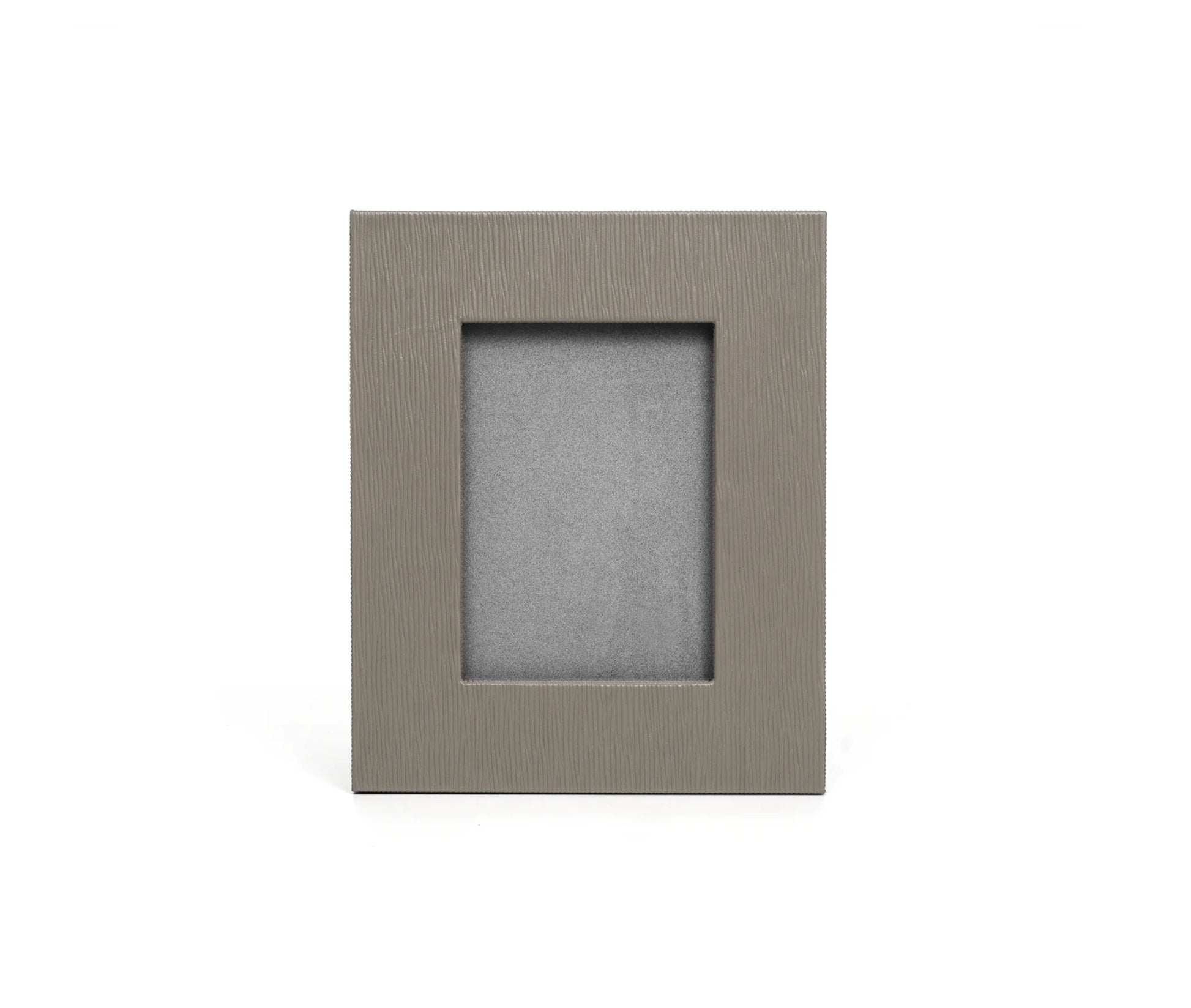 La nostra collezione di accessori per la casa accoglie questo nuovo set di 4 cornici portafoto, superbamente rifinite in morbida pelle di vitello e con chiusura magnetica sul retro, impreziosite da una fodera in pelle nabuk grigia.