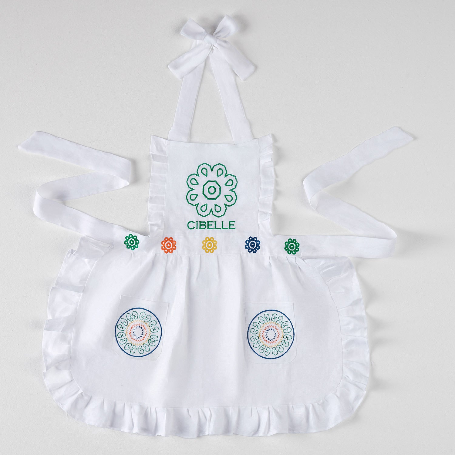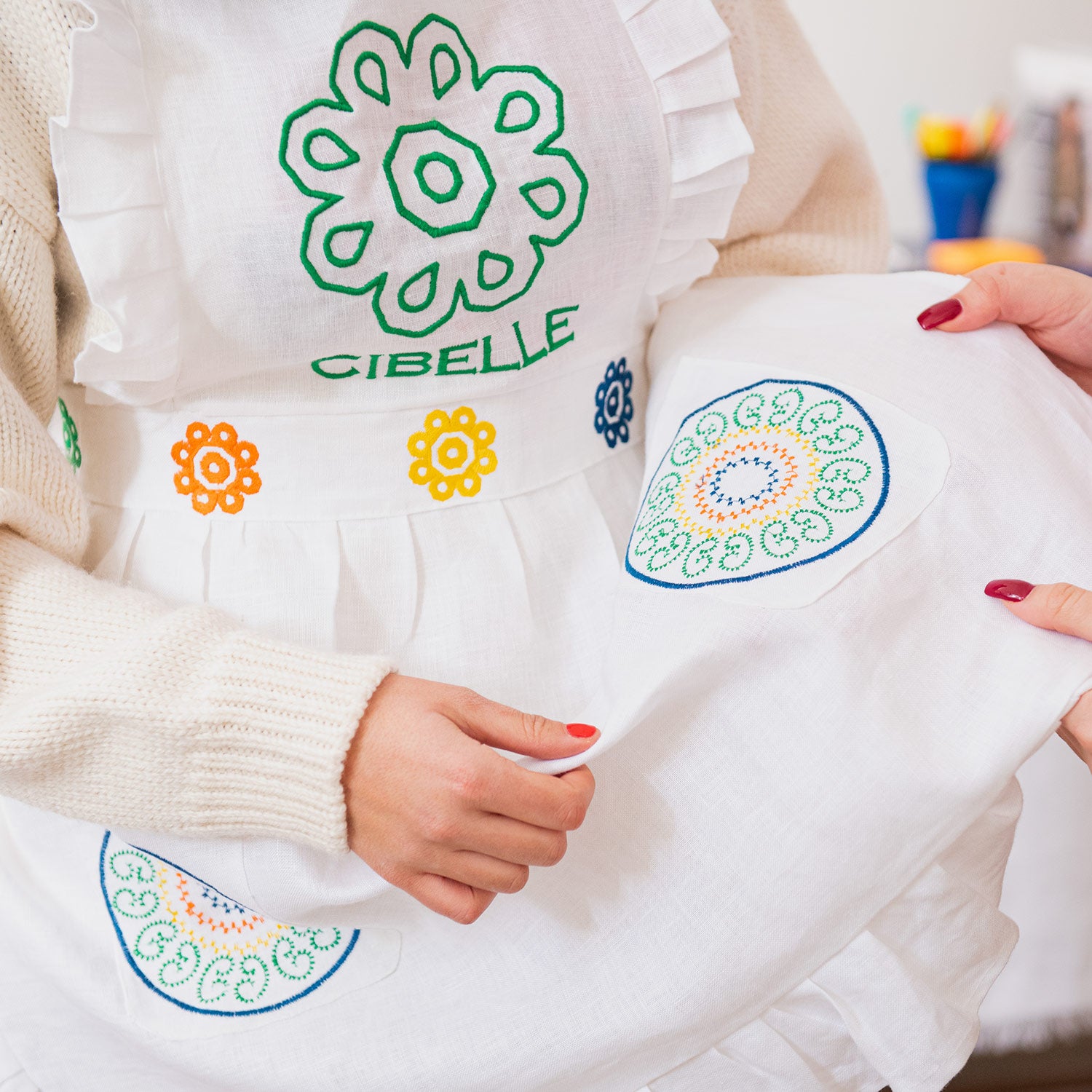 Grembiule ricamato artigianalmente in Italia con cotone makò su lino certificano Master of linen.
