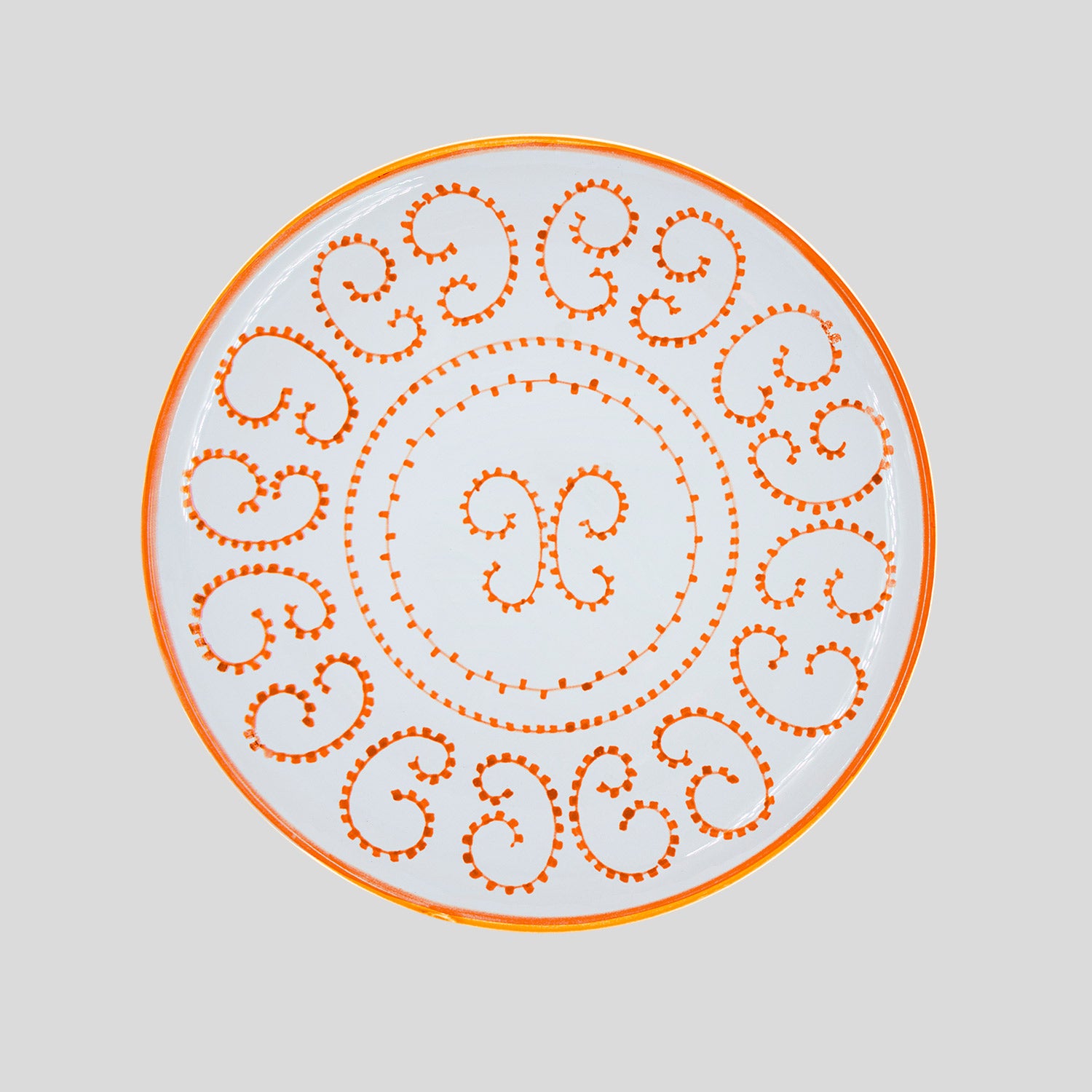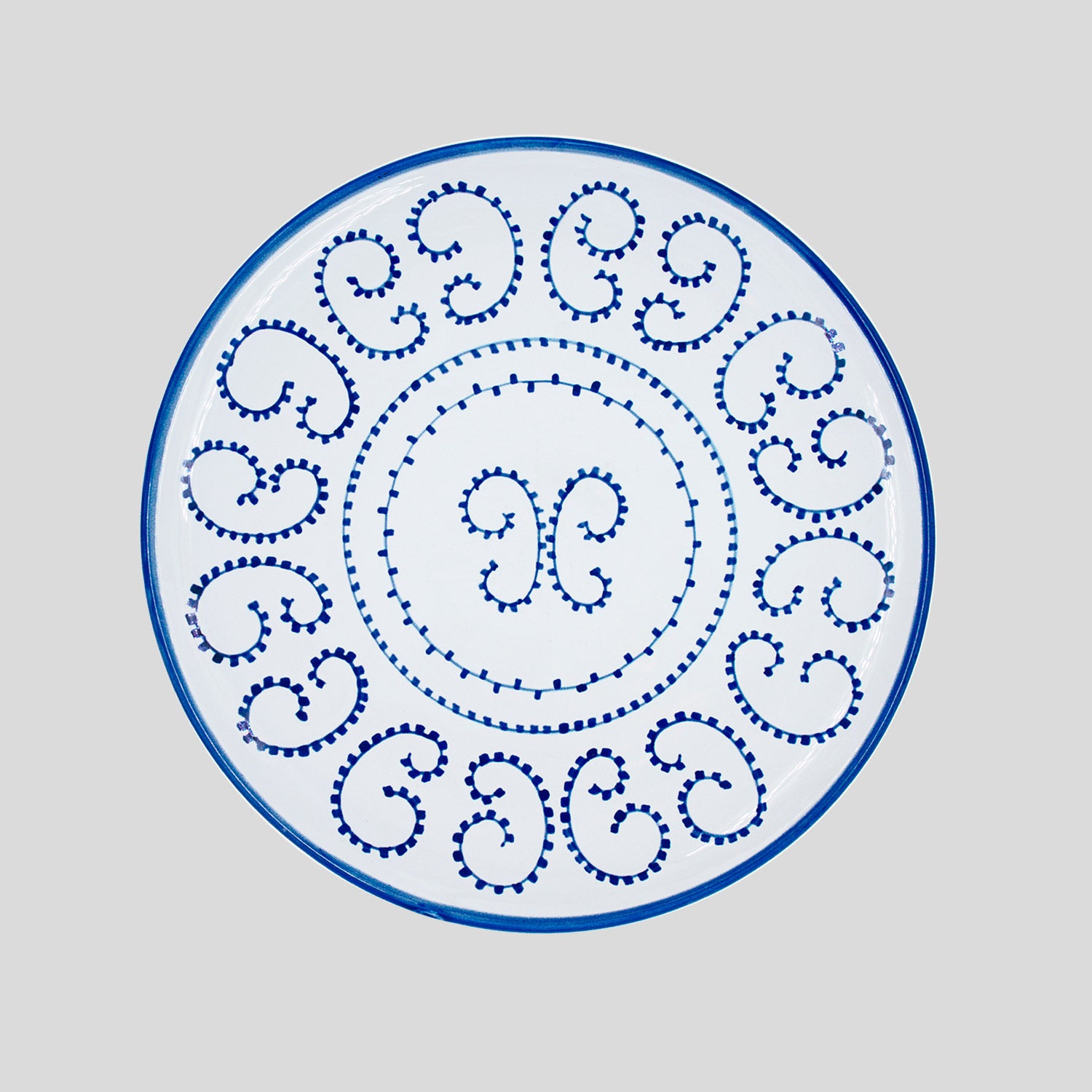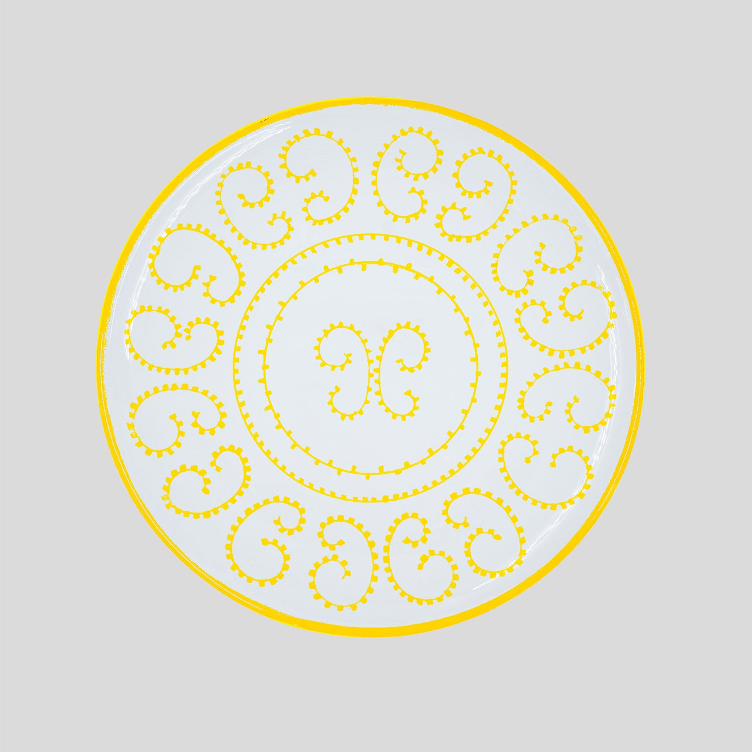 Piatto realizzato a mano da artigiani locali Pugliesi su disegni esclusivi dell’azienda Cibelle. Il design rappresenta le luci che decorano le facciate dei palazzi, le strade e i cortili durante le feste del Paese.