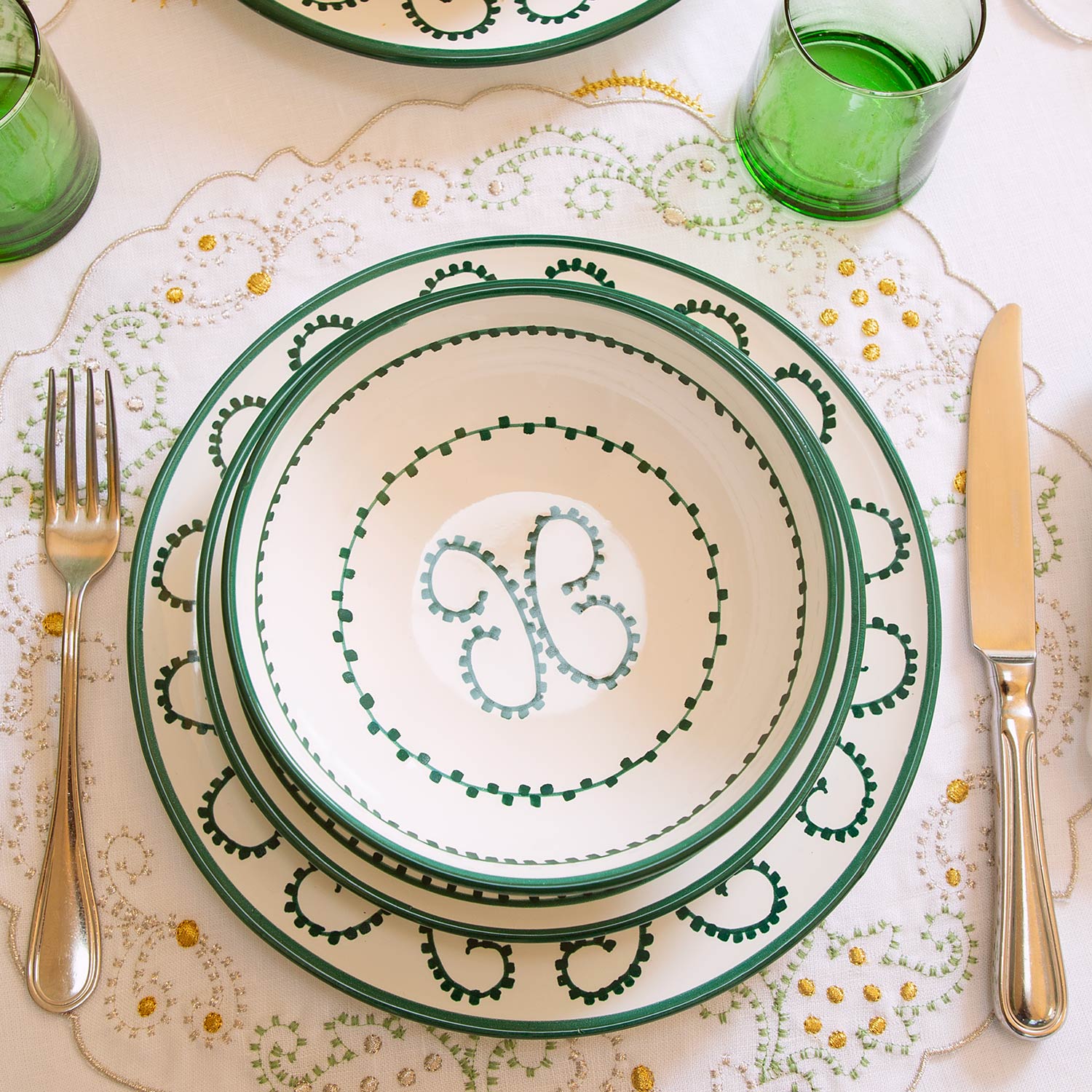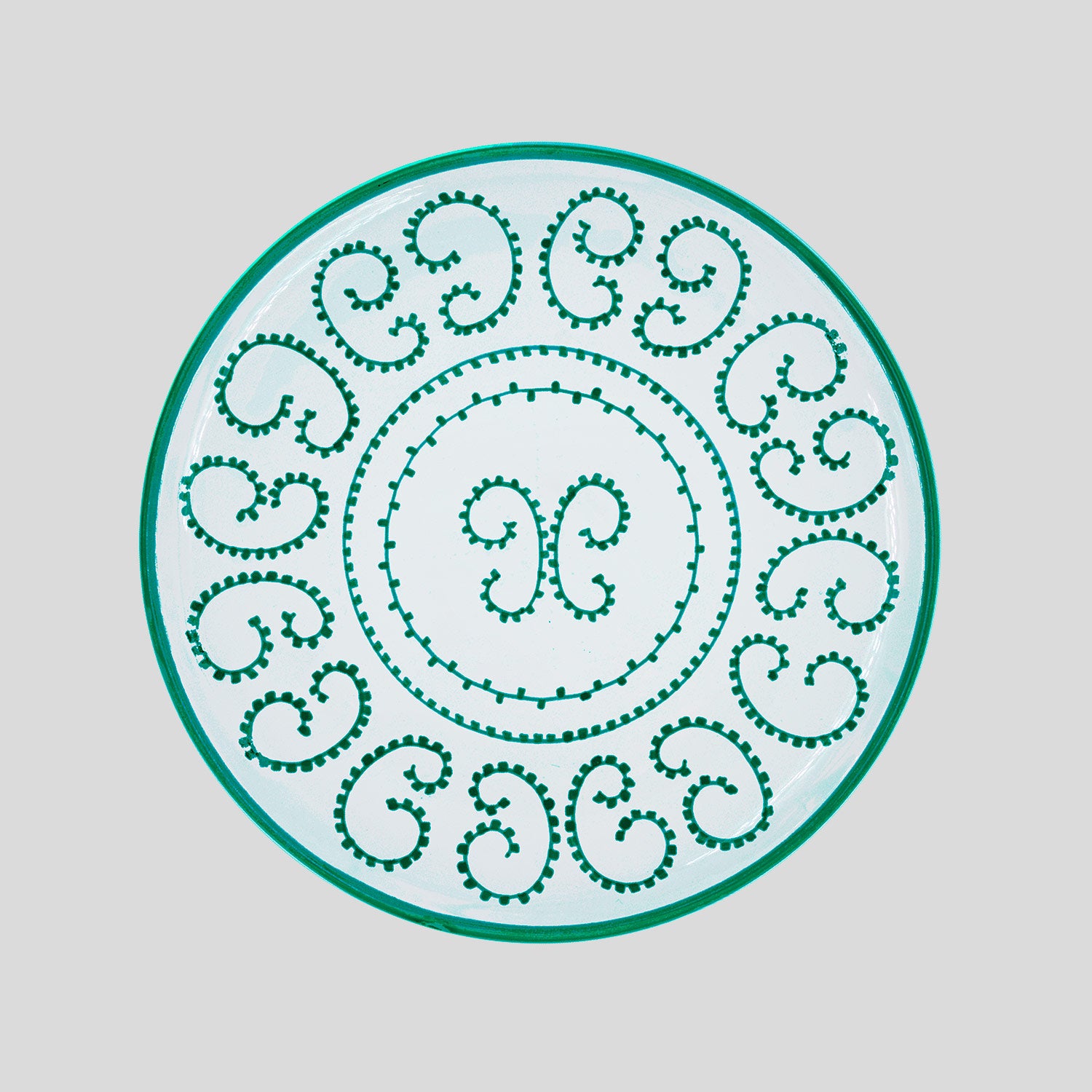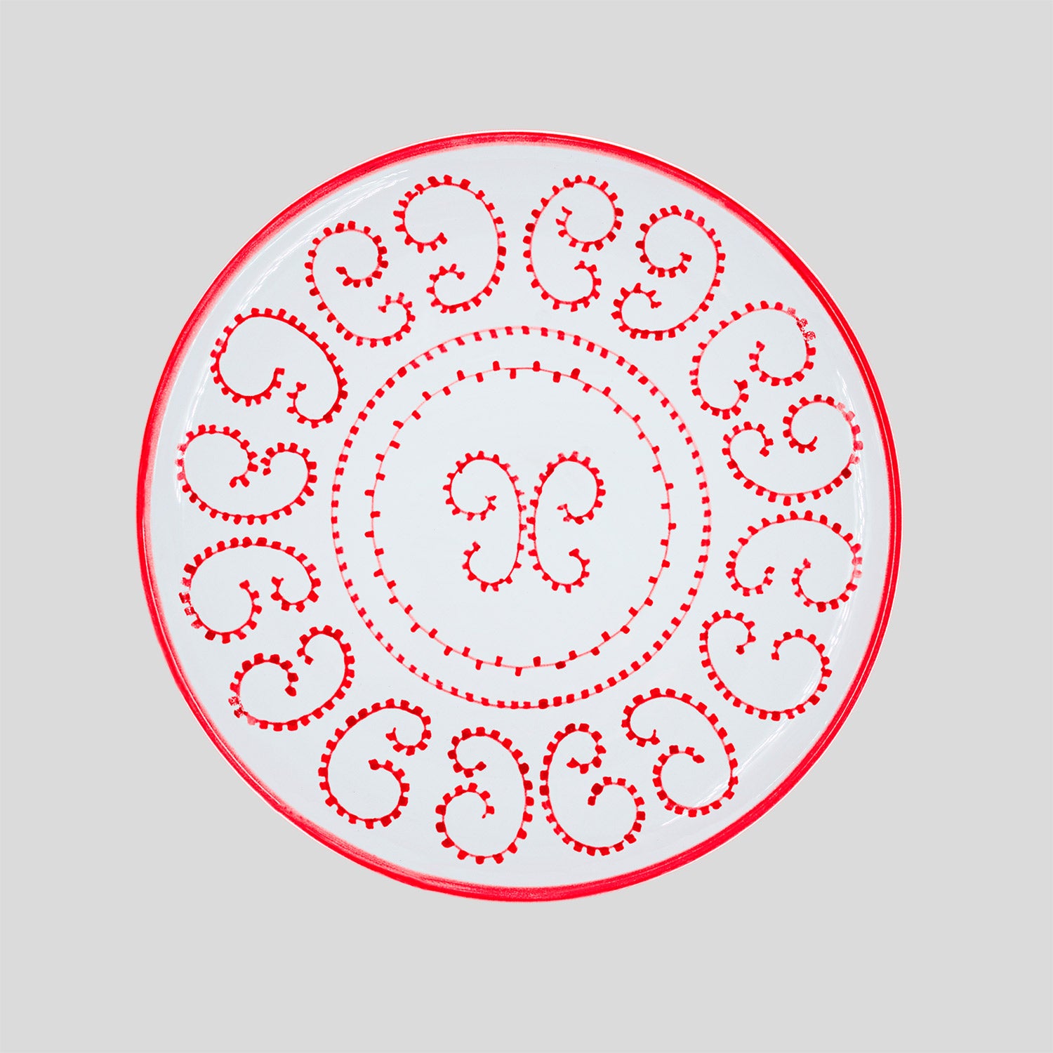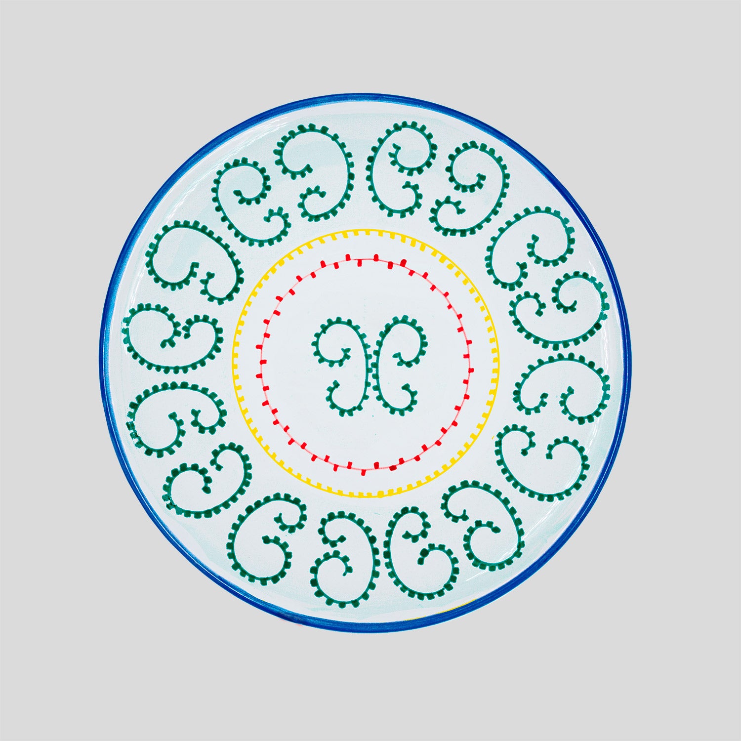 Piatto realizzato a mano da artigiani locali Pugliesi su disegni esclusivi dell’azienda Cibelle. Il design rappresenta le luci che decorano le facciate dei palazzi, le strade e i cortili durante le feste del Paese.