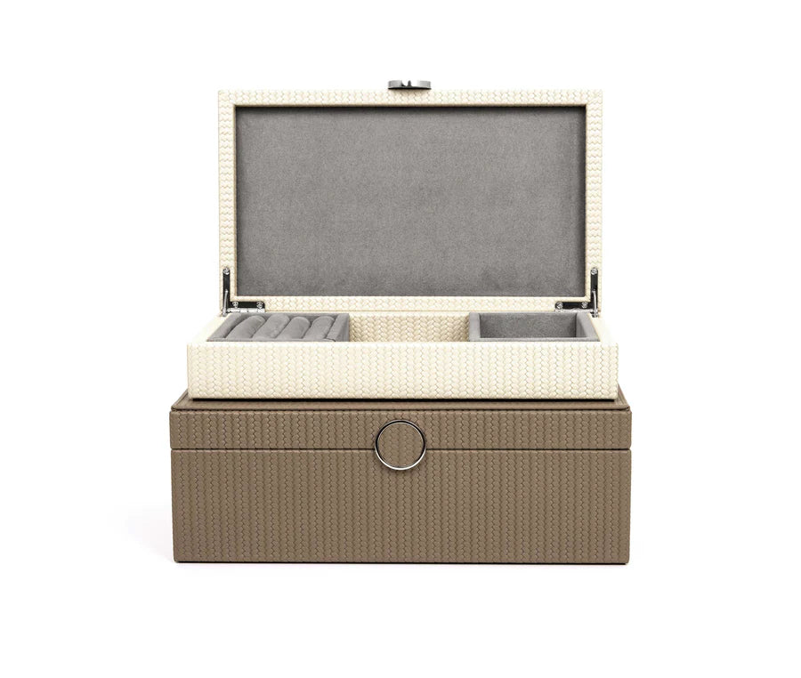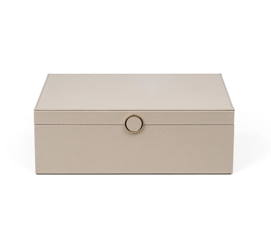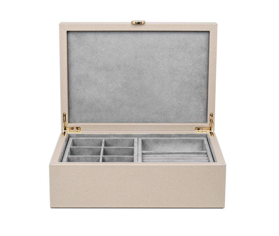 Disponibile in 3 diverse misure, la nostra inconfondibile texture in pelle ricopre questo cofanetto impreziosito da dettagli in oro lucido e rifinito con un interno in morbida pelle scamosciata.