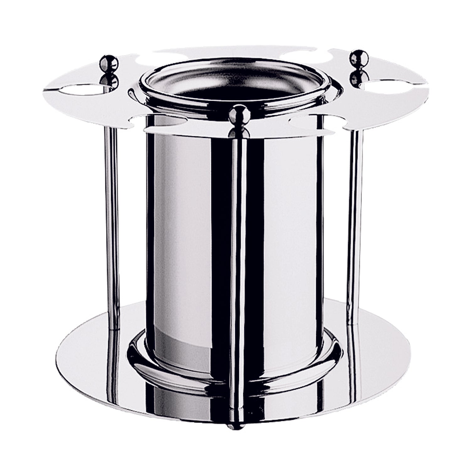 La struttura isolante avvolge la bottiglia, limitando la dispersione del freddo e proteggendo così l’effervescenza e il gusto delicato dello champagne. Un dettaglio unico e pratico di questo servizio è la presenza di fori superiori, studiati appositamente per conservare e organizzare i bicchieri da champagne in modo ordinato e sicuro. Questa caratteristica non solo facilita il servizio, ma crea anche un effetto estetico raffinato, rendendo il servizio un vero e proprio momento di classe.