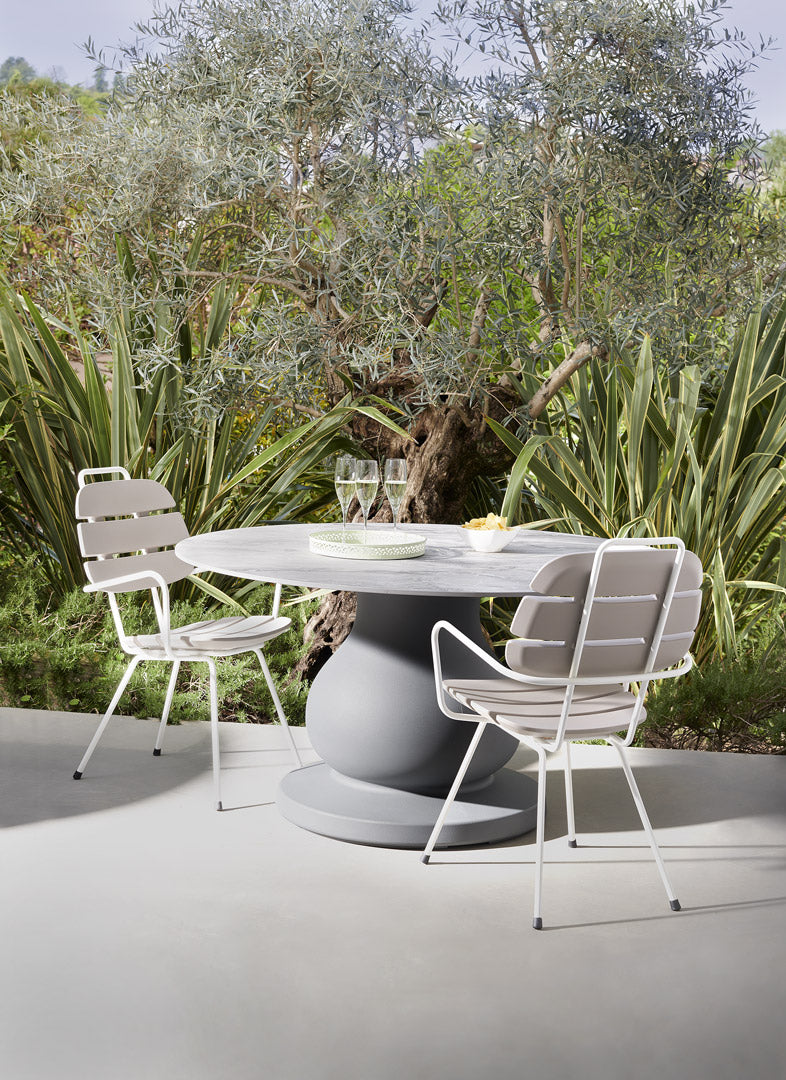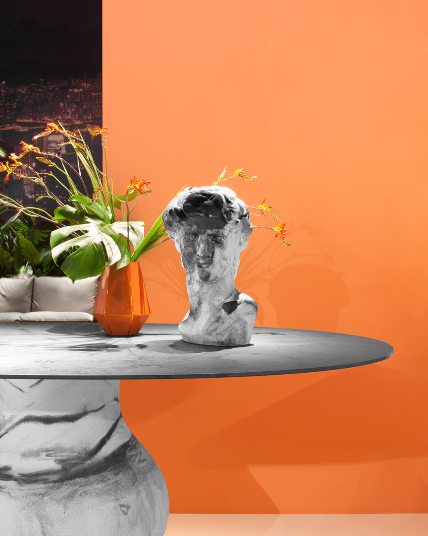 Ispirato al Neoclassicismo dei primi anni del XIX secolo, Paola Navone firma un classico per la sala da pranzo, nato grazie alla collaborazione con la produzione interna e la continua ricerca sulla lavorazione del materiale. Ne nascono così diverse composizioni, che si ispirano alle finiture del marmo più ricercate. A metà tra artigianato e industria, la profonda conoscenza del nostro reparto produttivo sulla lavorazione delle materie plastiche permette di creare una finitura unica in ogni pezzo, con tutte le imperfezioni che rendono stupendo il lavoro di un artigiano.