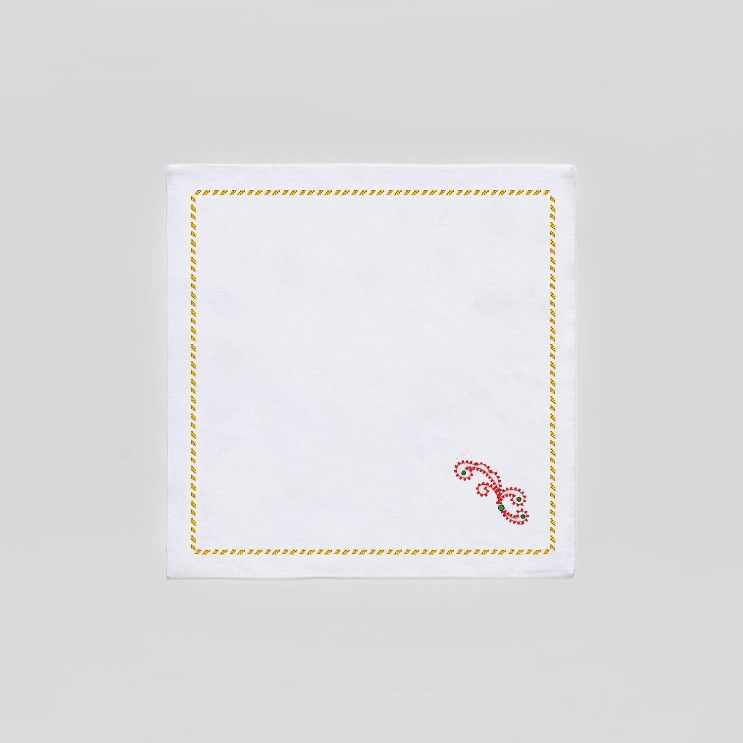 Tovagliolo artigianale ricamato in Italia con cotone makò su lino certificato Masters of linen. Il ricamo rappresenta le luci che decorano le facciate dei palazzi, le strade e i cortili durante le feste del Paese. Cibelle azienda specializzata in tessile per la tavola su 100% lino ricamato, dedica ai propri tessili molteplici ore di lavorazione per curare ogni dettaglio.