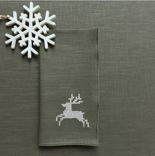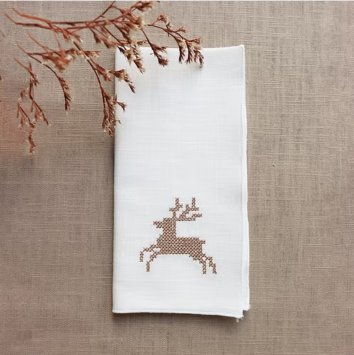 Tovagliolo moderno in lino con ricamo a PUNTO CROCE - Renna.