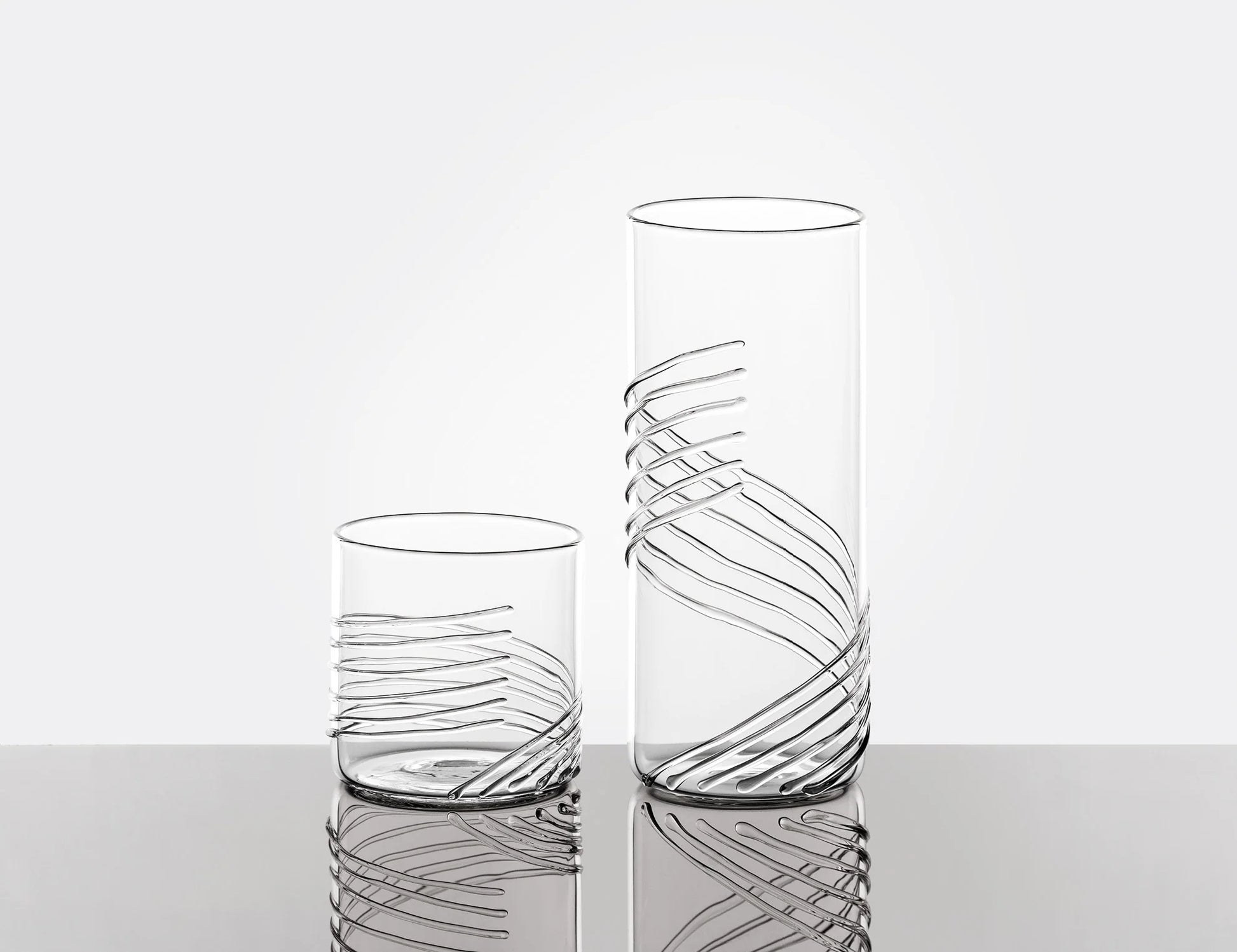 Delicati fili di vetro saldati a spirale intorno al bicchiere rendono omaggio all’artigianalità dei maestri soffiatori Blueside.