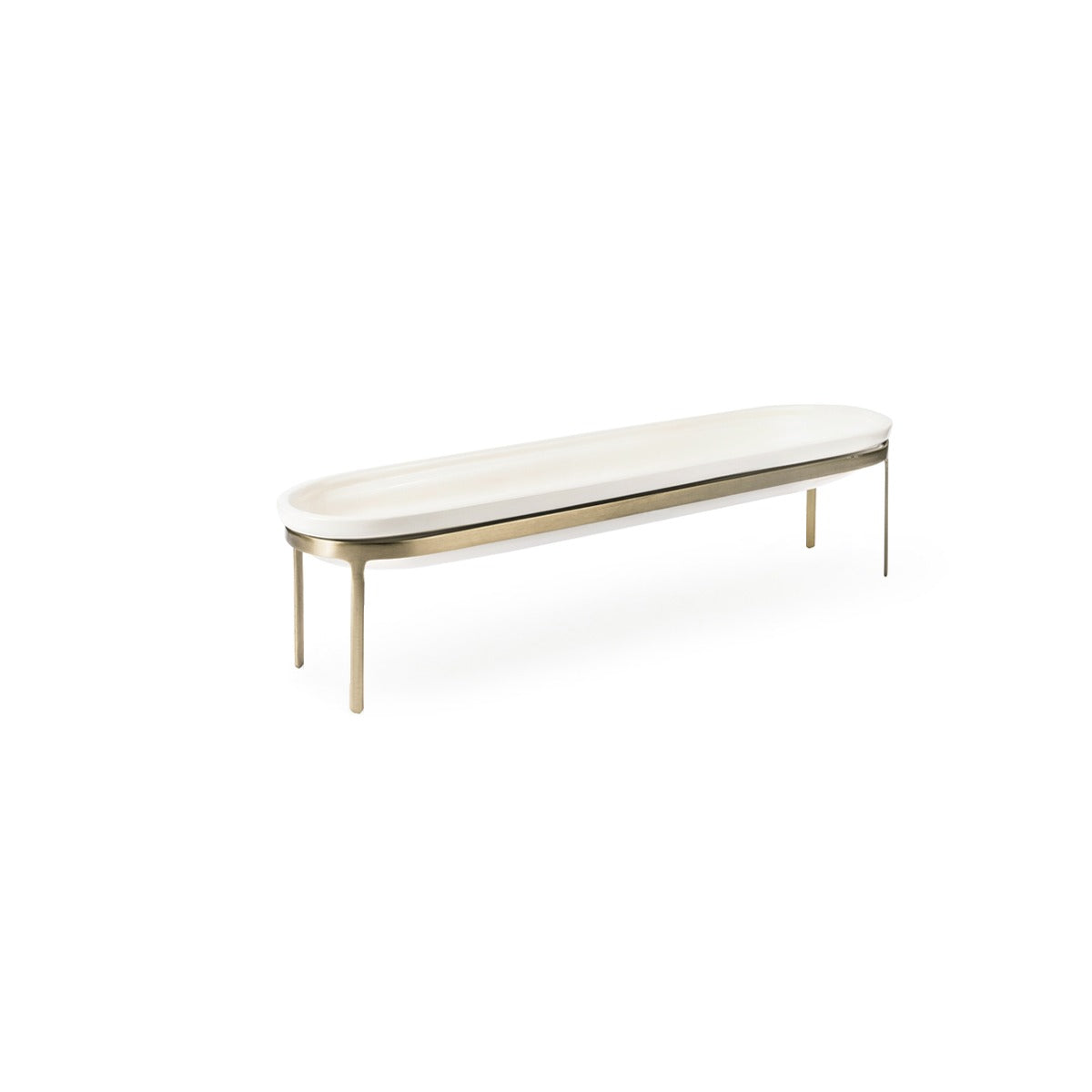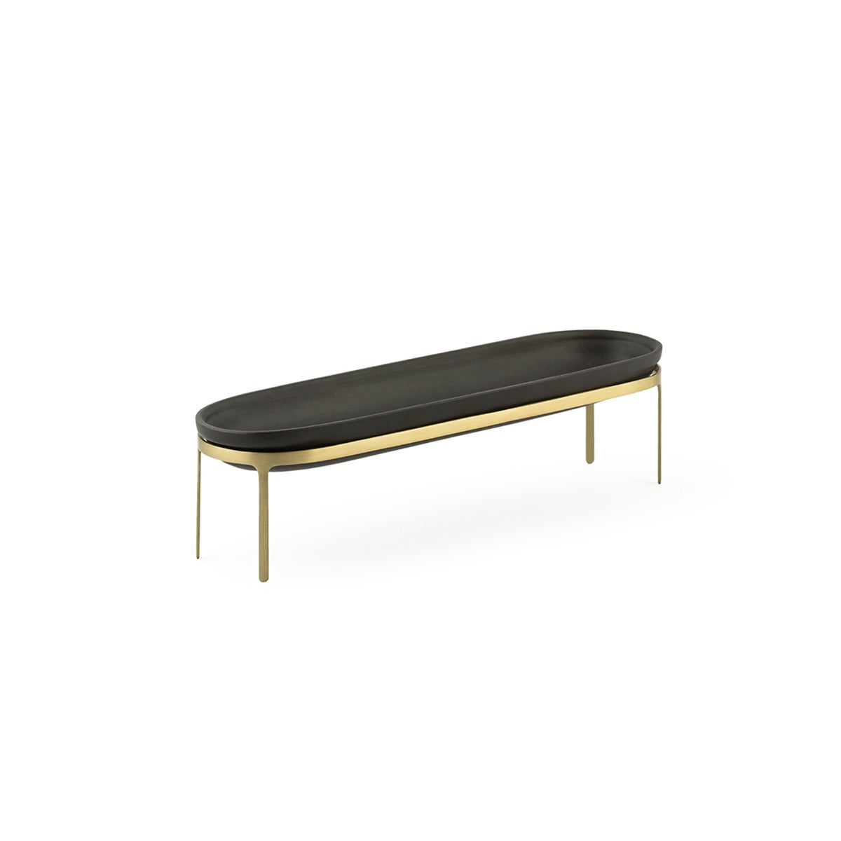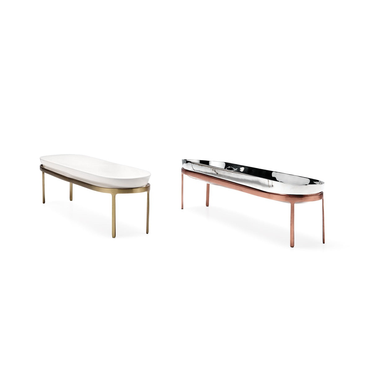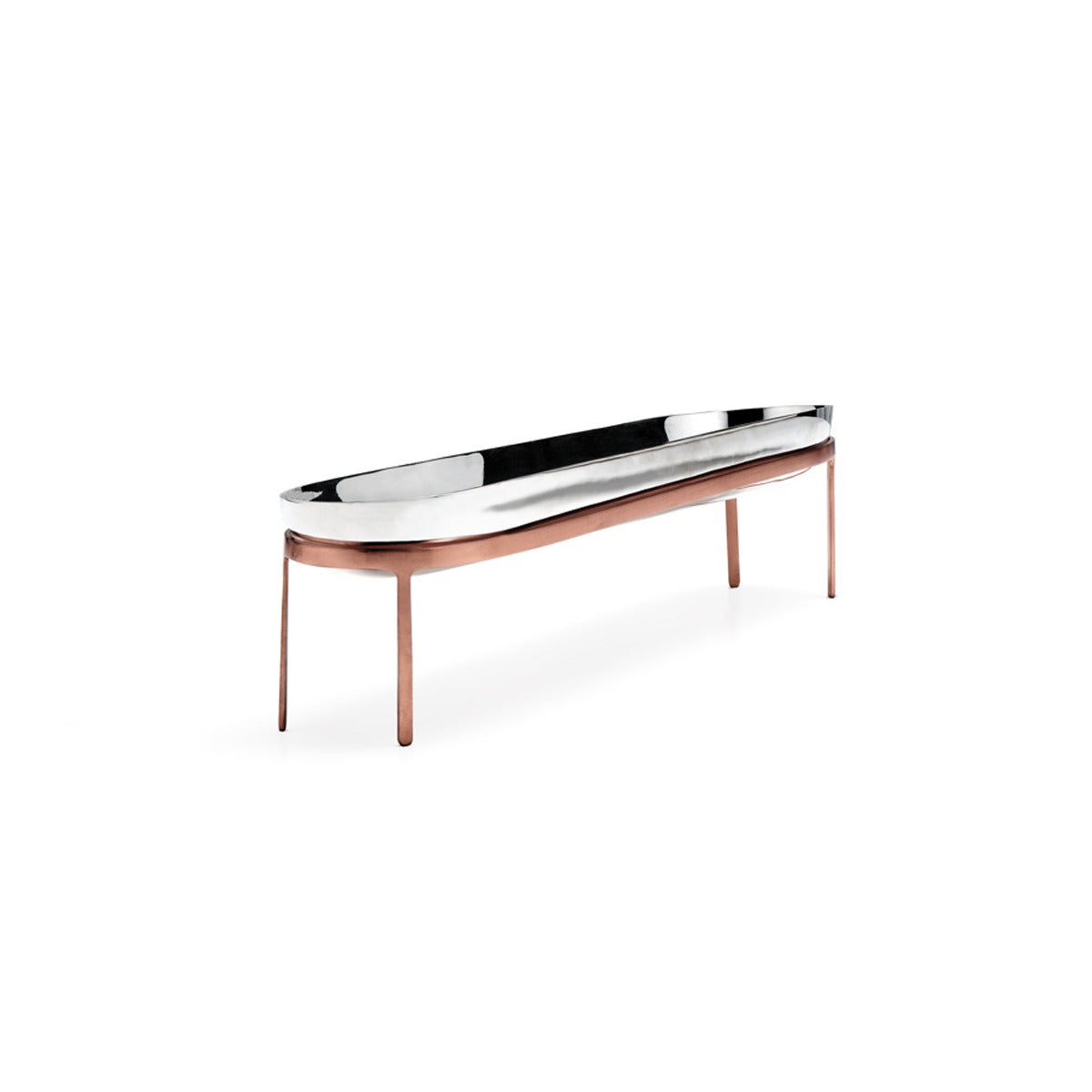 Vaschetta ovale con supporto. Disponibile in 2 versioni: vaschetta in silver-plated con supporto in rame o ciotola in ceramica, bianca o antracite, con supporto in ottone satinato.
