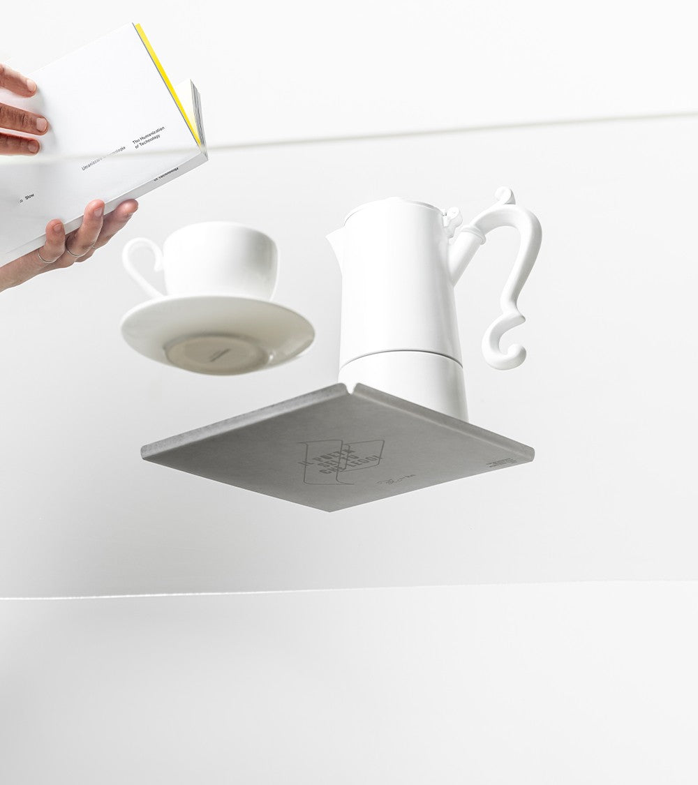 Il vassoio quadrato Storm 20×20 cm è realizzato in alluminio stone-washed, materiale resistente e leggero, progettato per garantire massima praticità in cucina e a tavola. Impilabile con gli altri vassoi della collezione (50×20 e 40×20 cm) per ottimizzare lo spazio, unisce forma essenziale e materiali puri. Il progetto rivela la sua anima più profonda solo quando l’oggetto viene rovesciato: lì si cela una “scaglia” del poeta visivo Ivan Tresoldi, frammento che invita a un dialogo silenzioso e personale con chi lo utilizza.