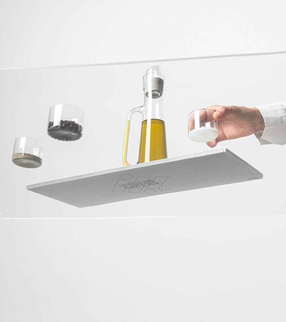 l vassoio rettangolare Storm 50×20 cm è realizzato in alluminio stone-washed, materiale resistente e leggero, progettato per garantire massima praticità in cucina e a tavola. Impilabile con gli altri vassoi della collezione (20×20 e 40×20 cm) per ottimizzare lo spazio, unisce forma essenziale e materiali puri. Il progetto rivela la sua anima più profonda solo quando l’oggetto viene rovesciato: lì si cela una “scaglia” del poeta visivo Ivan Tresoldi, frammento che invita a un dialogo silenzioso e personale con chi lo utilizza.
