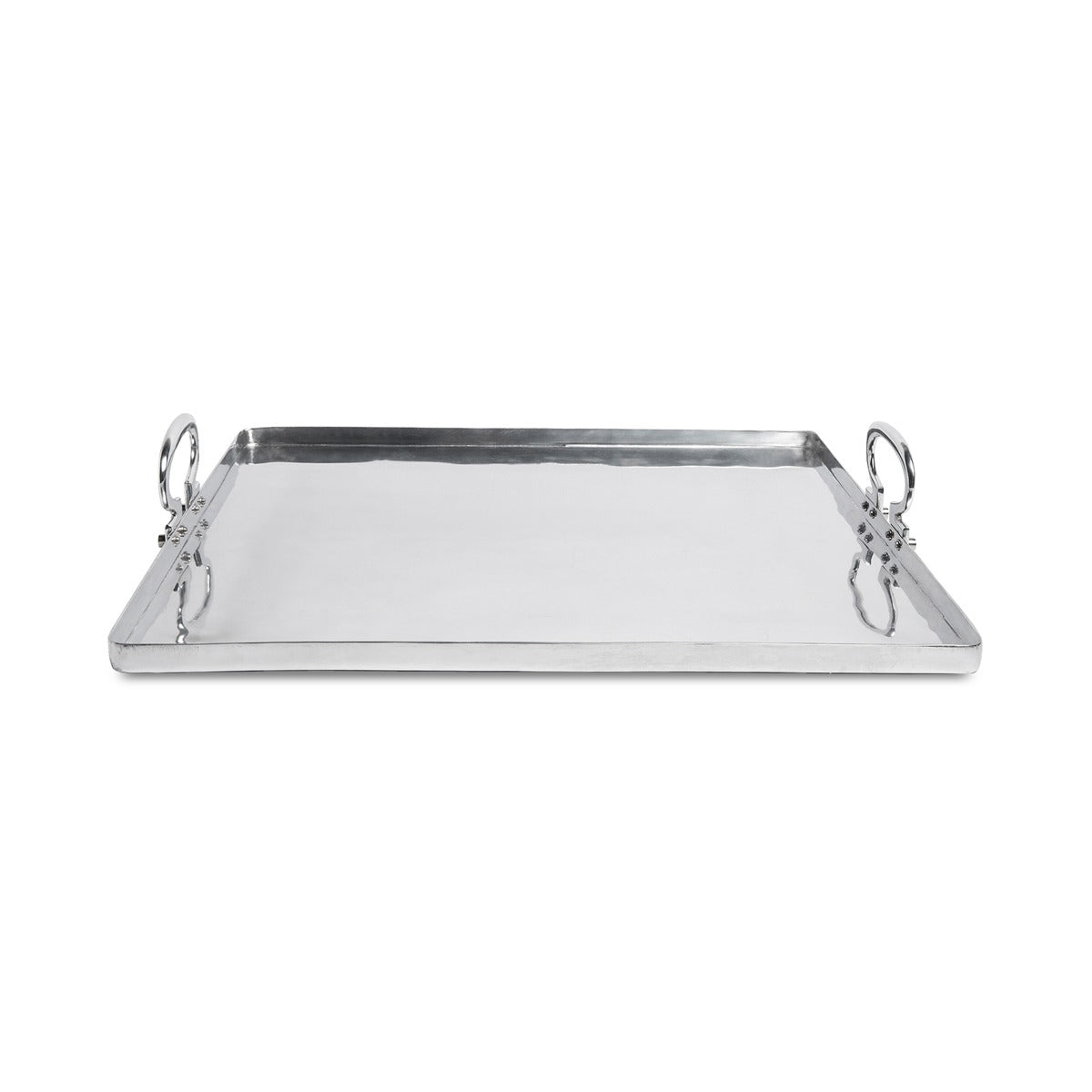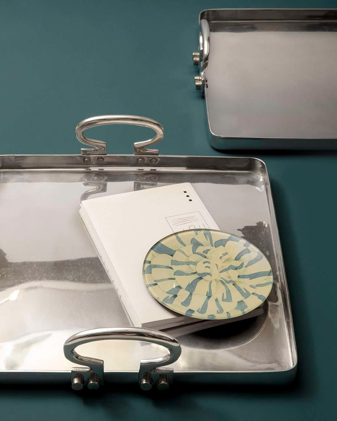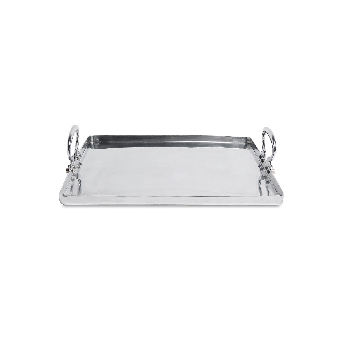 Vassoio quadrato in alluminio lucido con maniglie. Disponibile in 3 dimensioni.