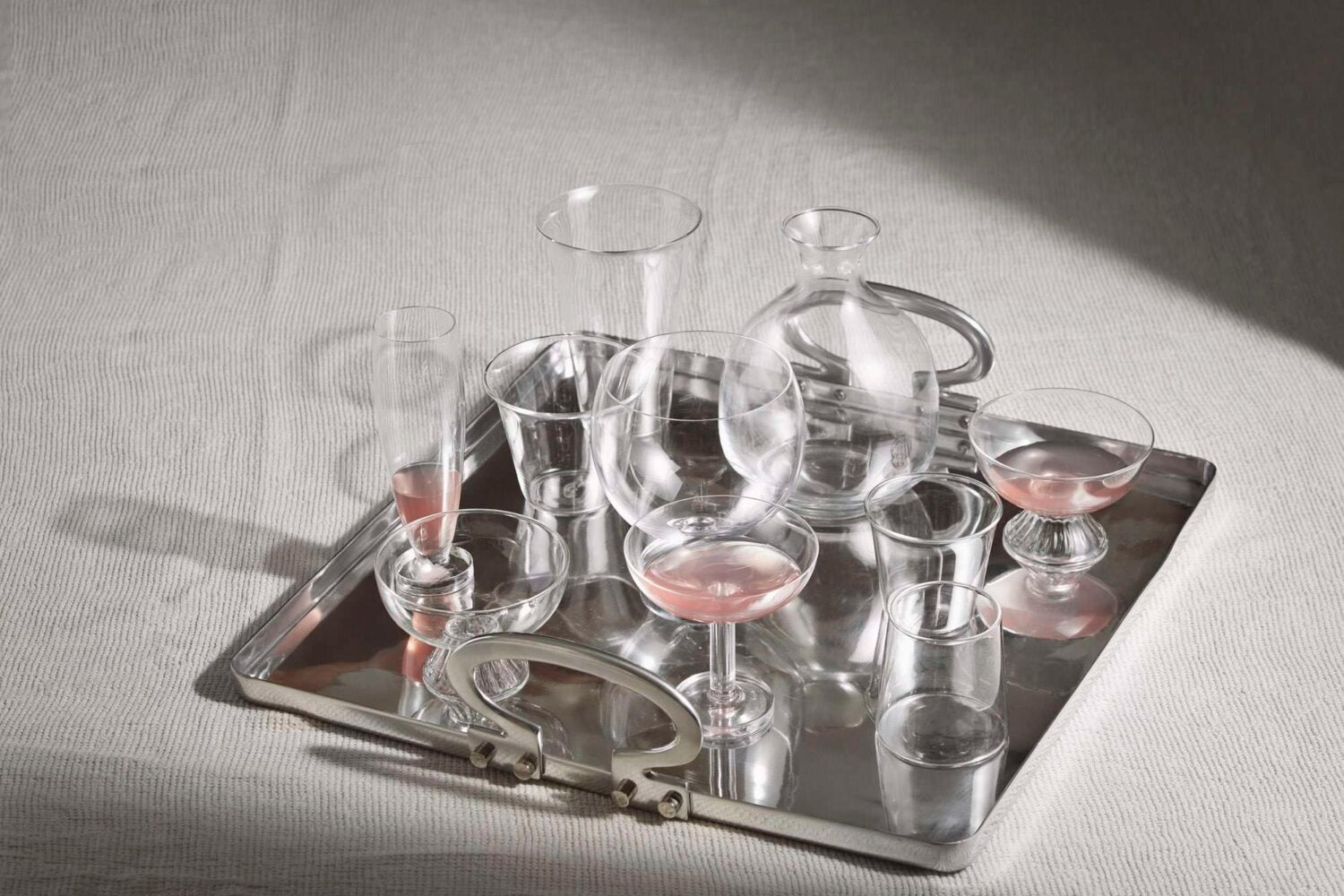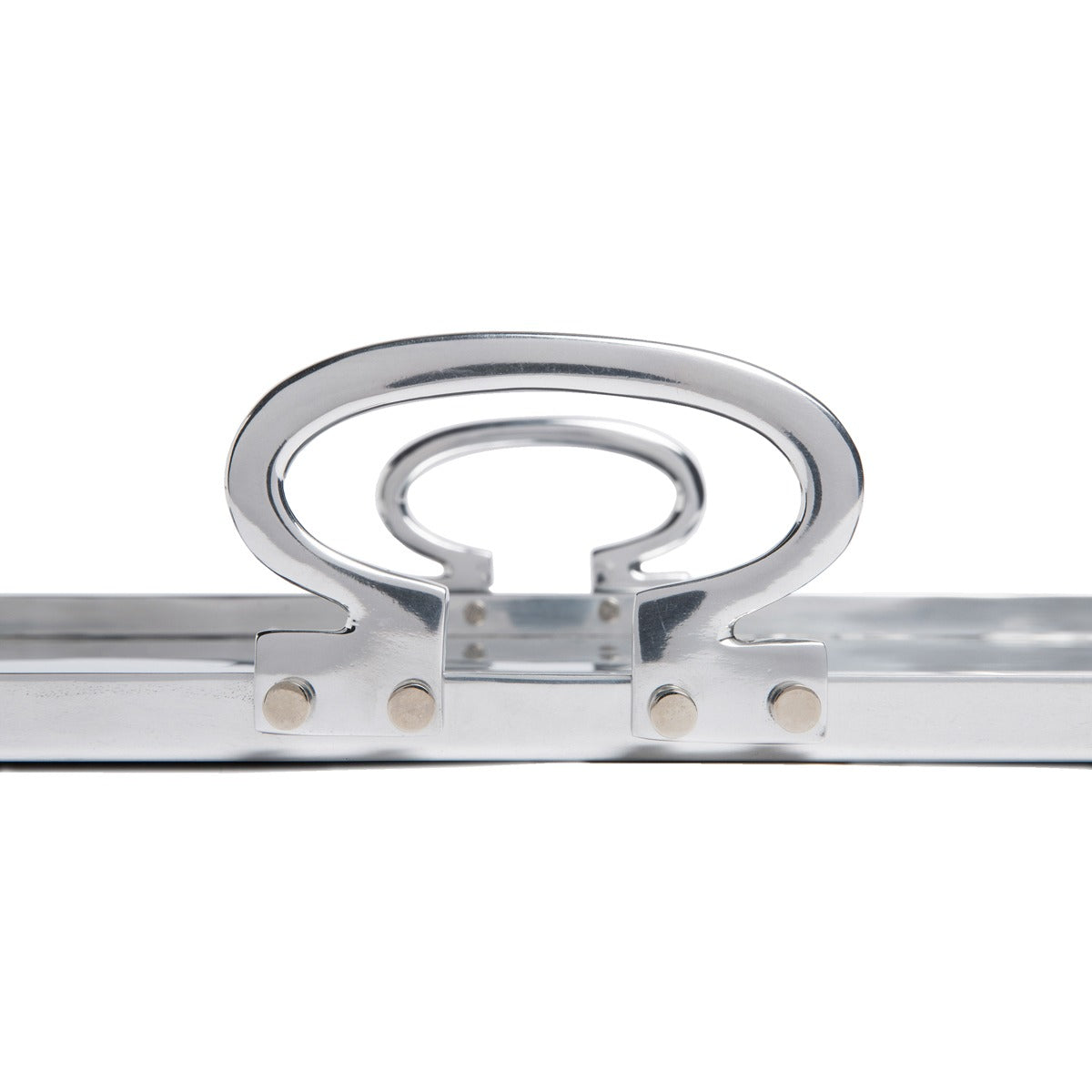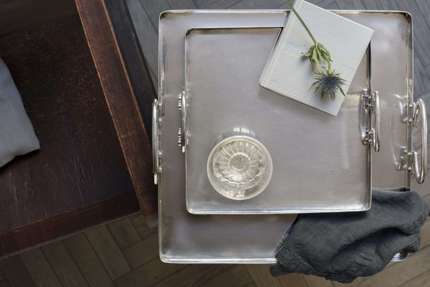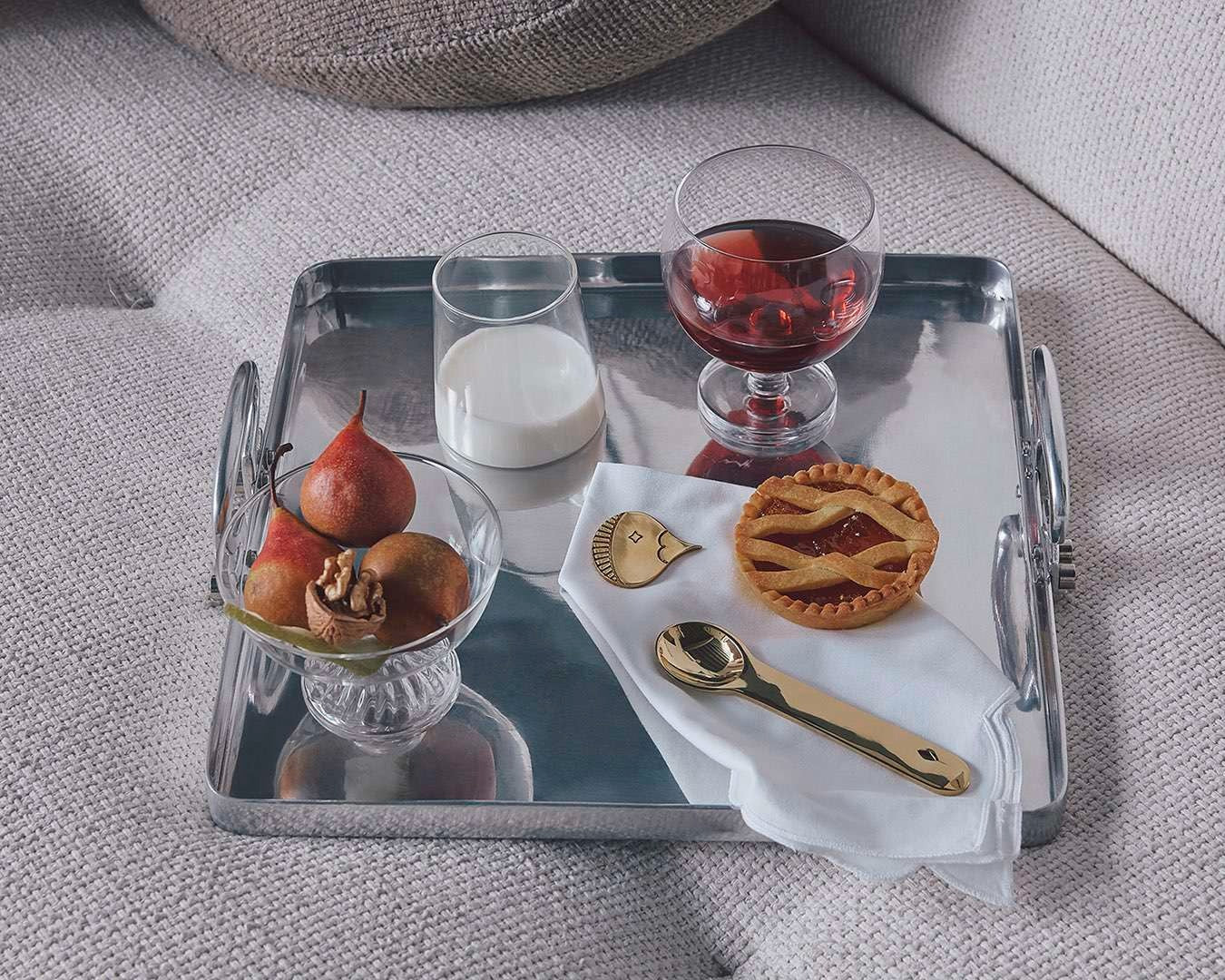 Vassoio quadrato in alluminio lucido con maniglie. Disponibile in 3 dimensioni.