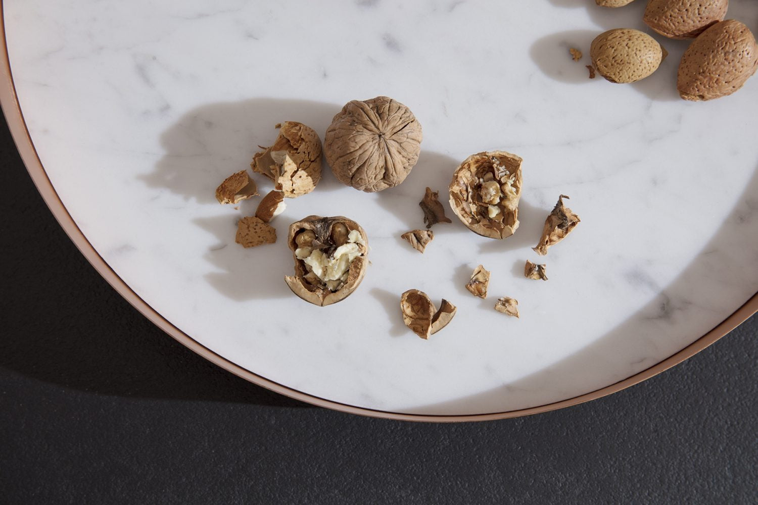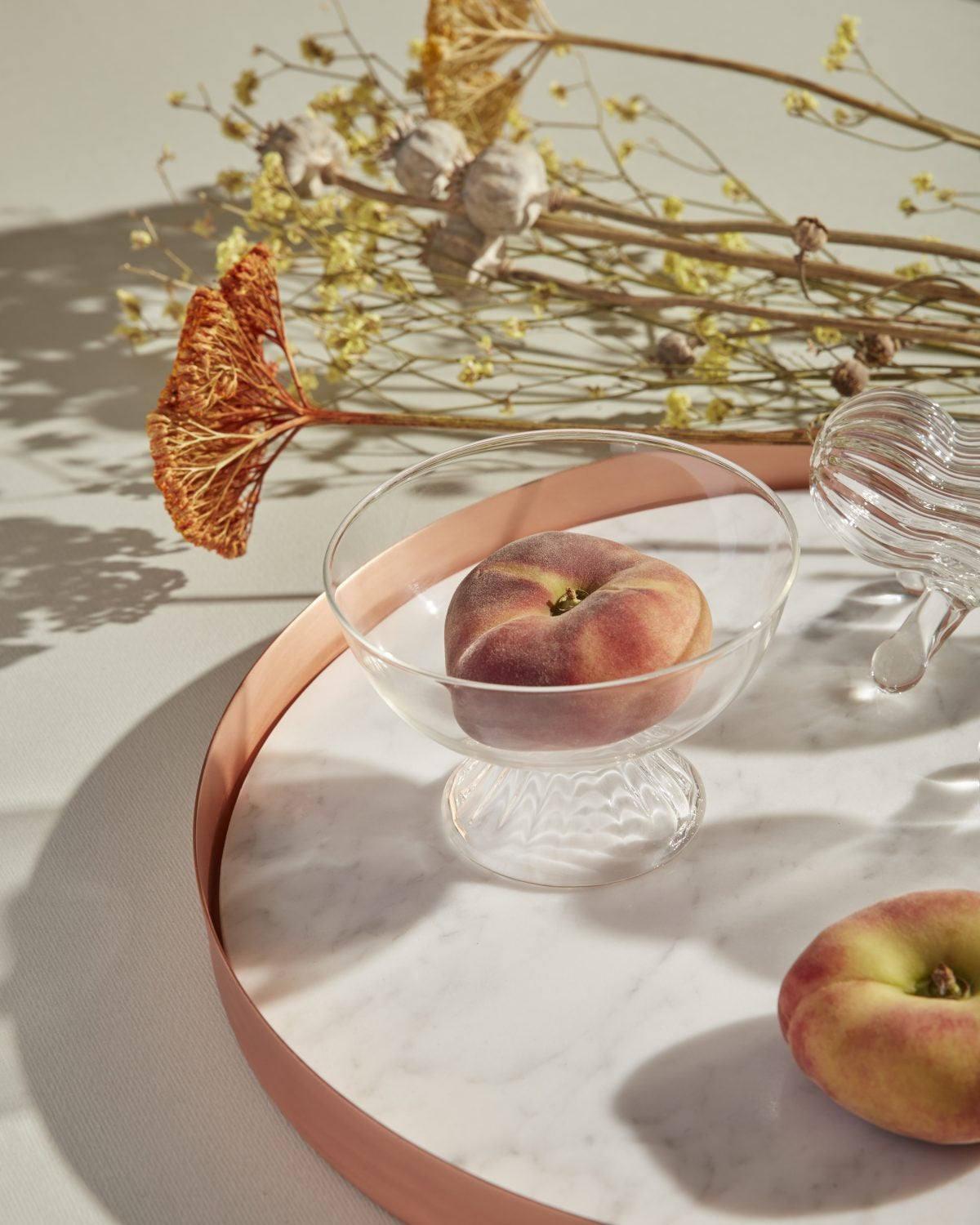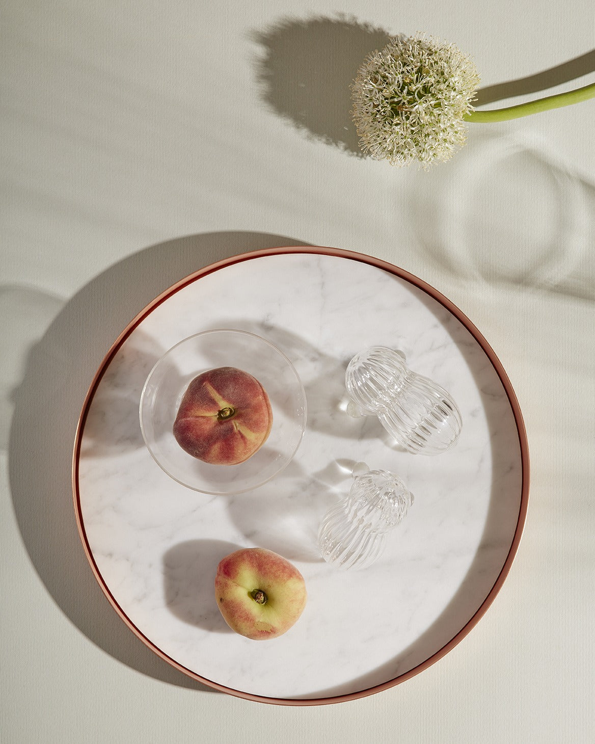 Vassoio in rame satinato disponibile con o senza piano in marmo e realizzato in 3 dimensioni. Prodotto fatto a mano.