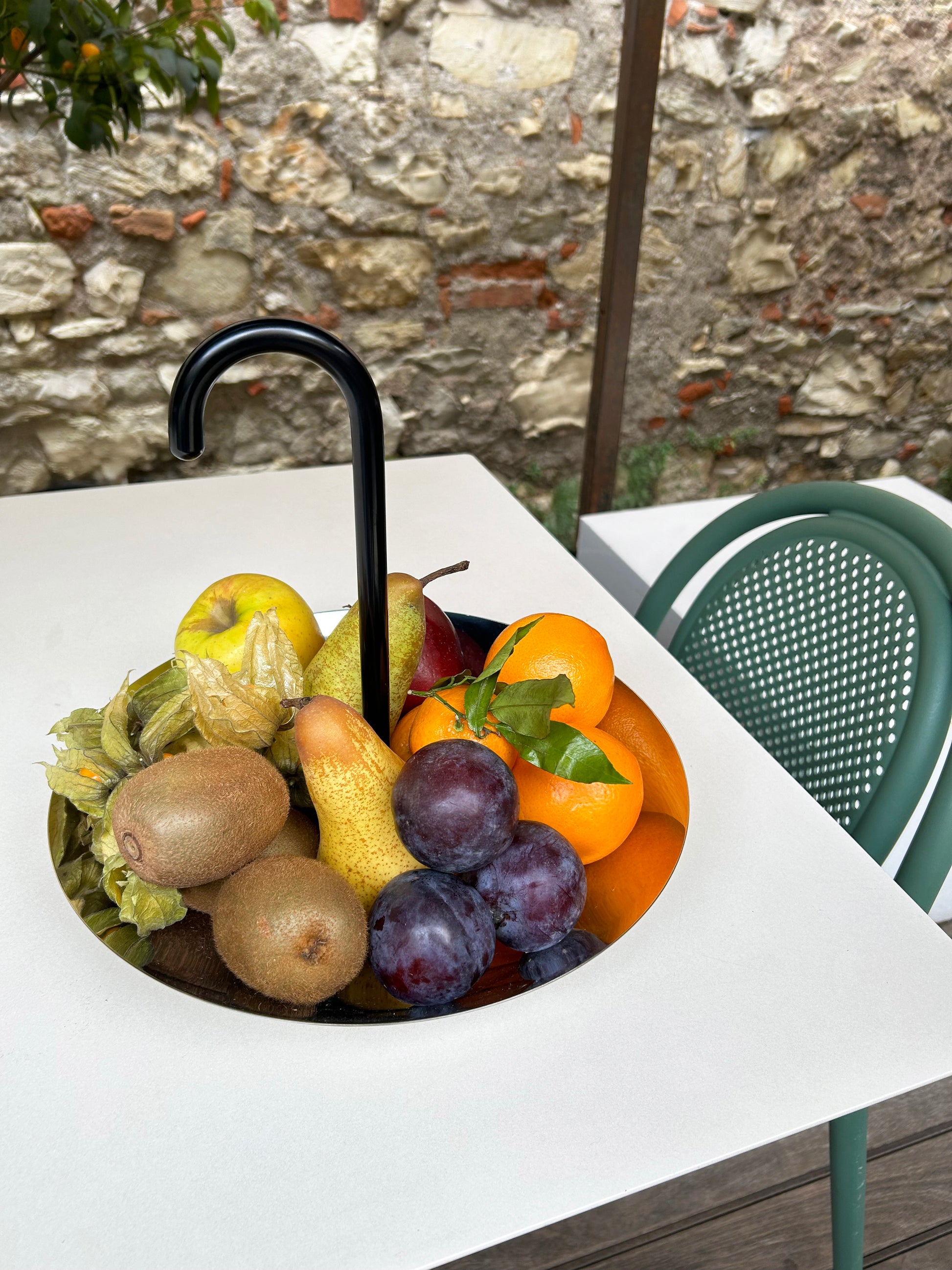 La collezione Rain rivoluziona il classico vassoio da portata con un design minimalista, funzionale e dal carattere innovativo. Il vassoio richiama la forma di un ombrello rovesciato, unendo un tocco di originalità a un’estetica elegante e contemporanea. Realizzati in pregiato acciaio inox 18/10, i vassoi garantiscono resistenza e una finitura raffinata, mentre il manico curvo in alluminio anodizzato, disponibile in sei colori vivaci, aggiunge personalità e praticità.